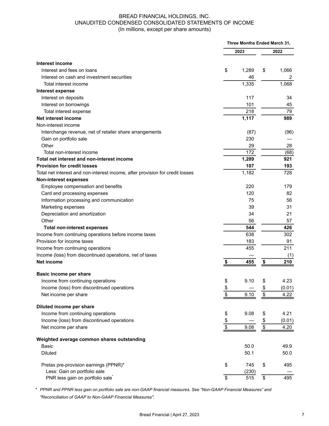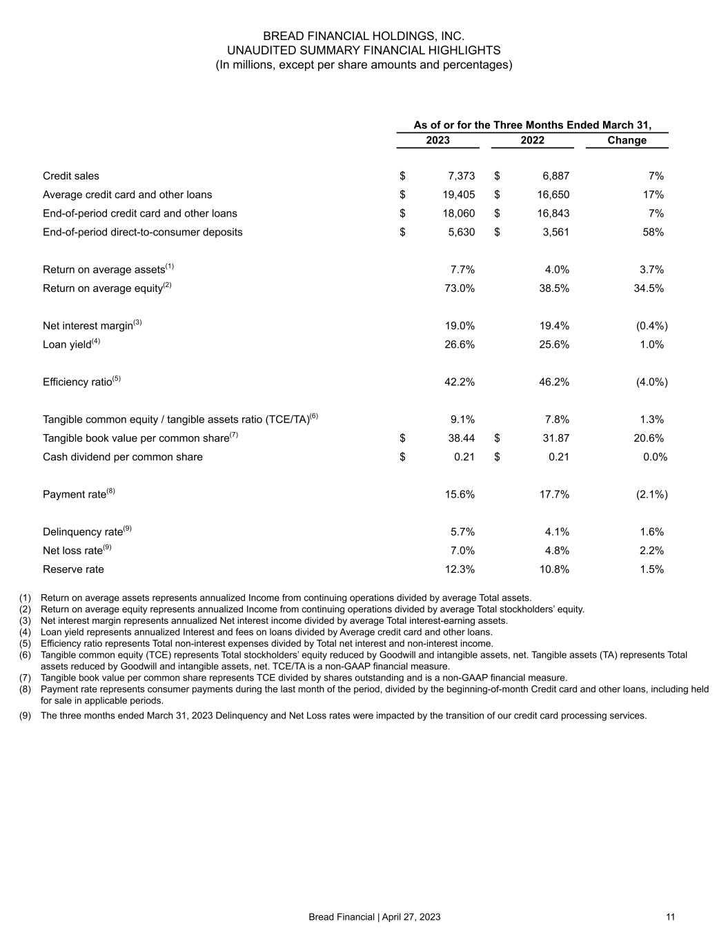 Bread Financial | April 27, 2023 4 First Quarter 2023 Compared with First Quarter 2022 – Continuing Operations • Credit sales were $7.4 billion for the first quarter of 2023, an increase of $0.5 billion, or 7%, versus the first quarter of 2022 driven by brand partner additions including AAA and the NFL, as well as growth across brand partners. • Average and end-of-period credit card and other loans were $19.4 billion and $18.1 billion, respectively, up 17% and 7%, respectively, driven by continued credit sales growth, new partner launches, as well as further moderation in the consumer payment rate, partially offset by the sale of the BJ's portfolio in February 2023. • Revenue increased $368 million, or 40%, resulting from a $230 million gain on portfolio sale and higher average loan balances. Excluding the gain on portfolio sale, revenue increased 15%. Net interest margin decreased 40 basis points year-over-year, due to increased reversals of interest and fee revenues resulting from higher gross losses. • Total non-interest expenses increased $118 million, or 28%, as employee compensation and benefit costs increased $41 million, or 23%, card and processing expenses increased $38 million, or 46%, and information processing and communications expenses increased $19 million, or 34%. • Income from continuing operations increased $244 million aligned with the improvement in PPNR and a lower provision for credit losses reflecting lower loan balances at quarter-end, due to both the sale of the BJ's portfolio and seasonal transactor balance paydowns. • PPNR, a non-GAAP financial measure, increased $250 million, or 50%, inclusive of the gain on portfolio sale. Excluding the sale, PPNR increased $20 million, or 4%, reflecting sustainable, quality growth and continued success in executing on our strategic priorities. • The delinquency rate of 5.7% increased from 4.1% in the first quarter of 2022 and increased from 5.5% in the fourth quarter of 2022. The increases were primarily the result of expected consumer payment rate normalization. • The net loss rate of 7.0% increased from 4.8% in the first quarter of 2022 and 6.3% in the fourth quarter of 2022. The first quarter of 2023 rate was impacted by the transition of our credit card processing services, as well as continued consumer payment rate normalization. Contacts Investor Relations: Brian Vereb (Brian.Vereb@breadfinancial.com) Media Relations: Rachel Stultz (Rachel.Stultz@breadfinancial.com)