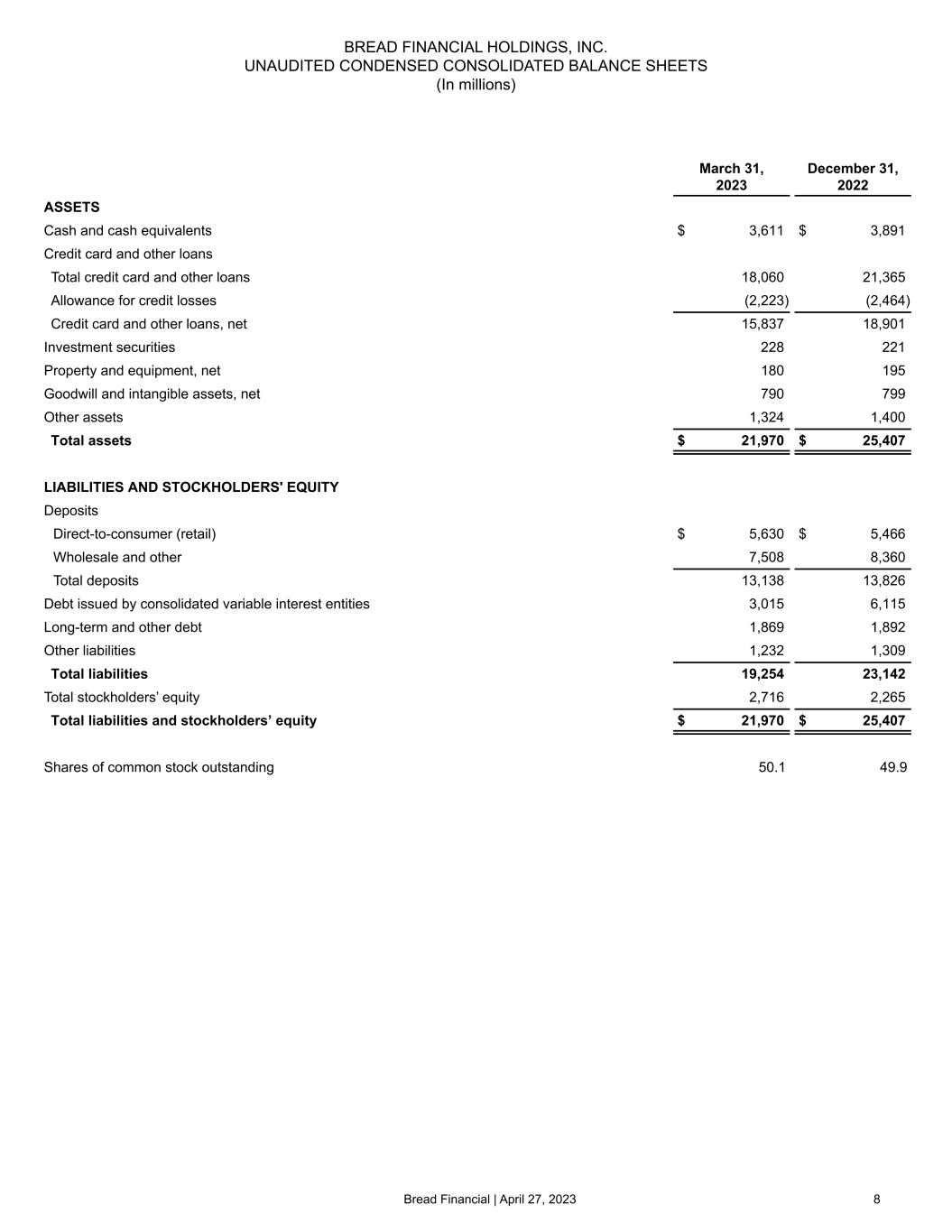 Bread Financial | April 27, 2023 7 BREAD FINANCIAL HOLDINGS, INC. UNAUDITED CONDENSED CONSOLIDATED STATEMENTS OF INCOME (In millions, except per share amounts) * PPNR and PPNR less gain on portfolio sale are non-GAAP financial measures. See “Non-GAAP Financial Measures” and "Reconciliation of GAAP to Non-GAAP Financial Measures". Three Months Ended March 31, 2023 2022 Interest income Interest and fees on loans $ 1,289 $ 1,066 Interest on cash and investment securities 46 2 Total interest income 1,335 1,068 Interest expense Interest on deposits 117 34 Interest on borrowings 101 45 Total interest expense 218 79 Net interest income 1,117 989 Non-interest income Interchange revenue, net of retailer share arrangements (87) (96) Gain on portfolio sale 230 — Other 29 28 Total non-interest income 172 (68) Total net interest and non-interest income 1,289 921 Provision for credit losses 107 193 Total net interest and non-interest income, after provision for credit losses 1,182 728 Non-interest expenses Employee compensation and benefits 220 179 Card and processing expenses 120 82 Information processing and communication 75 56 Marketing expenses 39 31 Depreciation and amortization 34 21 Other 56 57 Total non-interest expenses 544 426 Income from continuing operations before income taxes 638 302 Provision for income taxes 183 91 Income from continuing operations 455 211 Income (loss) from discontinued operations, net of taxes — (1) Net income $ 455 $ 210 Basic income per share Income from continuing operations $ 9.10 $ 4.23 Income (loss) from discontinued operations $ — $ (0.01) Net income per share $ 9.10 $ 4.22 Diluted income per share Income from continuing operations $ 9.08 $ 4.21 Income (loss) from discontinued operations $ — $ (0.01) Net income per share $ 9.08 $ 4.20 Weighted average common shares outstanding Basic 50.0 49.9 Diluted 50.1 50.0 Pretax pre-provision earnings (PPNR)* $ 745 $ 495 Less: Gain on portfolio sale (230) — PNR less gain on portfolio sale* $ 515 $ 495