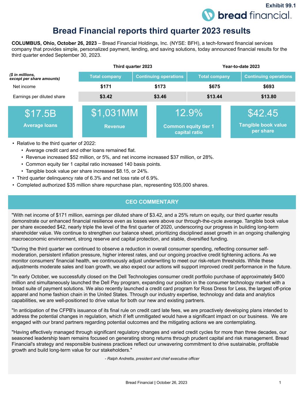 Bread Financial | October 26, 2023 1 "With net income of $171 million, earnings per diluted share of $3.42, and a 25% return on equity, our third quarter results demonstrate our enhanced financial resilience even as losses were above our through-the-cycle average. Tangible book value per share exceeded $42, nearly triple the level of the first quarter of 2020, underscoring our progress in building long-term shareholder value. We continue to strengthen our balance sheet, prioritizing disciplined asset growth in an ongoing challenging macroeconomic environment, strong reserve and capital protection, and stable, diversified funding. "During the third quarter we continued to observe a reduction in overall consumer spending, reflecting consumer self- moderation, persistent inflation pressure, higher interest rates, and our ongoing proactive credit tightening actions. As we monitor consumers' financial health, we continuously adjust underwriting to meet our risk-return thresholds. While these adjustments moderate sales and loan growth, we also expect our actions will support improved credit performance in the future. "In early October, we successfully closed on the Dell Technologies consumer credit portfolio purchase of approximately $400 million and simultaneously launched the Dell Pay program, expanding our position in the consumer technology market with a broad suite of payment solutions. We also recently launched a credit card program for Ross Dress for Less, the largest off-price apparel and home fashion chain in the United States. Through our industry expertise, technology and data and analytics capabilities, we are well-positioned to drive value for both our new and existing partners. "In anticipation of the CFPB's issuance of its final rule on credit card late fees, we are proactively developing plans intended to address the potential changes in regulation, which if left unmitigated would have a significant impact on our business. We are engaged with our brand partners regarding potential outcomes and the mitigating actions we are contemplating. "Having effectively managed through significant regulatory changes and varied credit cycles for more than three decades, our seasoned leadership team remains focused on generating strong returns through prudent capital and risk management. Bread Financial's strategy and responsible business practices reflect our unwavering commitment to drive sustainable, profitable growth and build long-term value for our stakeholders." - Ralph Andretta, president and chief executive officer Third quarter 2023 Year-to-date 2023 ($ in millions, except per share amounts) Total company Continuing operations Total company Continuing operations Net income $171 $173 $675 $693 Earnings per diluted share $3.42 $3.46 $13.44 $13.80 Bread Financial reports third quarter 2023 results CEO COMMENTARY COLUMBUS, Ohio, October 26, 2023 – Bread Financial Holdings, Inc. (NYSE: BFH), a tech-forward financial services company that provides simple, personalized payment, lending, and saving solutions, today announced financial results for the third quarter ended September 30, 2023. • Relative to the third quarter of 2022: • Average credit card and other loans remained flat. • Revenue increased $52 million, or 5%, and net income increased $37 million, or 28%. • Common equity tier 1 capital ratio increased 140 basis points. • Tangible book value per share increased $8.15, or 24%. • Third quarter delinquency rate of 6.3% and net loss rate of 6.9%. • Completed authorized $35 million share repurchase plan, representing 935,000 shares. $17.5B Average loans $1,031MM Revenue 12.9% Common equity tier 1 capital ratio $42.45 Tangible book value per share Exhibit 99.1