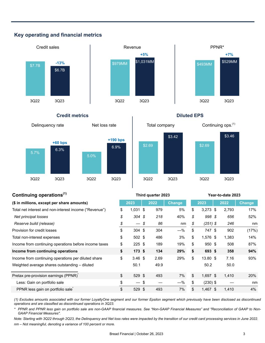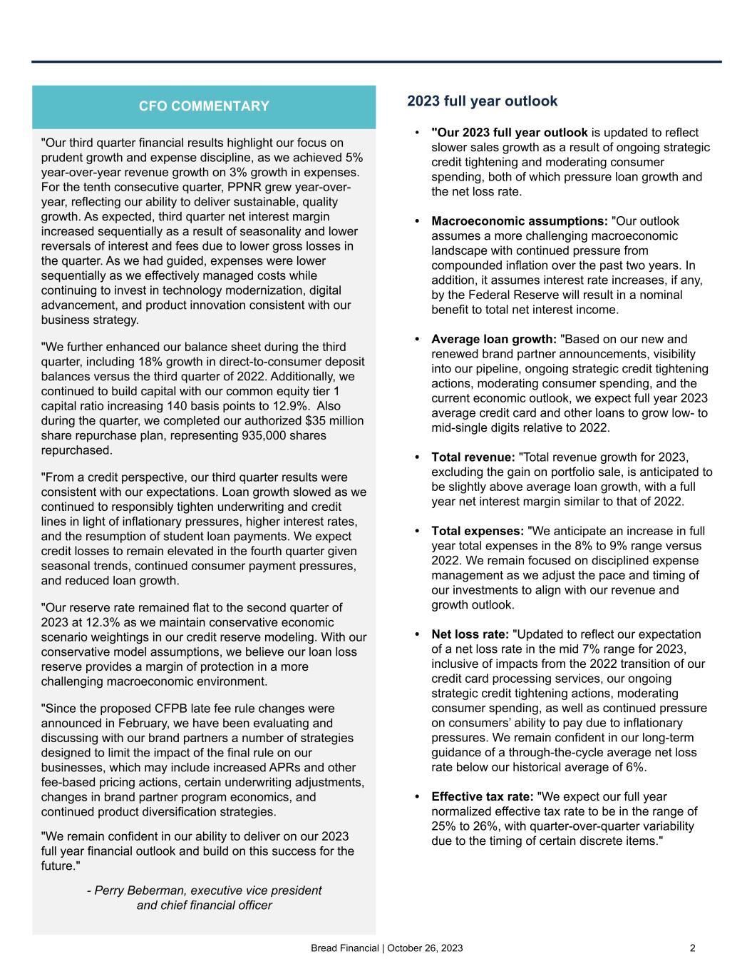 Bread Financial | October 26, 2023 2 "Our third quarter financial results highlight our focus on prudent growth and expense discipline, as we achieved 5% year-over-year revenue growth on 3% growth in expenses. For the tenth consecutive quarter, PPNR grew year-over- year, reflecting our ability to deliver sustainable, quality growth. As expected, third quarter net interest margin increased sequentially as a result of seasonality and lower reversals of interest and fees due to lower gross losses in the quarter. As we had guided, expenses were lower sequentially as we effectively managed costs while continuing to invest in technology modernization, digital advancement, and product innovation consistent with our business strategy. "We further enhanced our balance sheet during the third quarter, including 18% growth in direct-to-consumer deposit balances versus the third quarter of 2022. Additionally, we continued to build capital with our common equity tier 1 capital ratio increasing 140 basis points to 12.9%. Also during the quarter, we completed our authorized $35 million share repurchase plan, representing 935,000 shares repurchased. "From a credit perspective, our third quarter results were consistent with our expectations. Loan growth slowed as we continued to responsibly tighten underwriting and credit lines in light of inflationary pressures, higher interest rates, and the resumption of student loan payments. We expect credit losses to remain elevated in the fourth quarter given seasonal trends, continued consumer payment pressures, and reduced loan growth. "Our reserve rate remained flat to the second quarter of 2023 at 12.3% as we maintain conservative economic scenario weightings in our credit reserve modeling. With our conservative model assumptions, we believe our loan loss reserve provides a margin of protection in a more challenging macroeconomic environment. "Since the proposed CFPB late fee rule changes were announced in February, we have been evaluating and discussing with our brand partners a number of strategies designed to limit the impact of the final rule on our businesses, which may include increased APRs and other fee-based pricing actions, certain underwriting adjustments, changes in brand partner program economics, and continued product diversification strategies. "We remain confident in our ability to deliver on our 2023 full year financial outlook and build on this success for the future." - Perry Beberman, executive vice president and chief financial officer 2023 full year outlook • "Our 2023 full year outlook is updated to reflect slower sales growth as a result of ongoing strategic credit tightening and moderating consumer spending, both of which pressure loan growth and the net loss rate. • Macroeconomic assumptions: "Our outlook assumes a more challenging macroeconomic landscape with continued pressure from compounded inflation over the past two years. In addition, it assumes interest rate increases, if any, by the Federal Reserve will result in a nominal benefit to total net interest income. • Average loan growth: "Based on our new and renewed brand partner announcements, visibility into our pipeline, ongoing strategic credit tightening actions, moderating consumer spending, and the current economic outlook, we expect full year 2023 average credit card and other loans to grow low- to mid-single digits relative to 2022. • Total revenue: "Total revenue growth for 2023, excluding the gain on portfolio sale, is anticipated to be slightly above average loan growth, with a full year net interest margin similar to that of 2022. • Total expenses: "We anticipate an increase in full year total expenses in the 8% to 9% range versus 2022. We remain focused on disciplined expense management as we adjust the pace and timing of our investments to align with our revenue and growth outlook. • Net loss rate: "Updated to reflect our expectation of a net loss rate in the mid 7% range for 2023, inclusive of impacts from the 2022 transition of our credit card processing services, our ongoing strategic credit tightening actions, moderating consumer spending, as well as continued pressure on consumers’ ability to pay due to inflationary pressures. We remain confident in our long-term guidance of a through-the-cycle average net loss rate below our historical average of 6%. • Effective tax rate: "We expect our full year normalized effective tax rate to be in the range of 25% to 26%, with quarter-over-quarter variability due to the timing of certain discrete items." CFO COMMENTARY