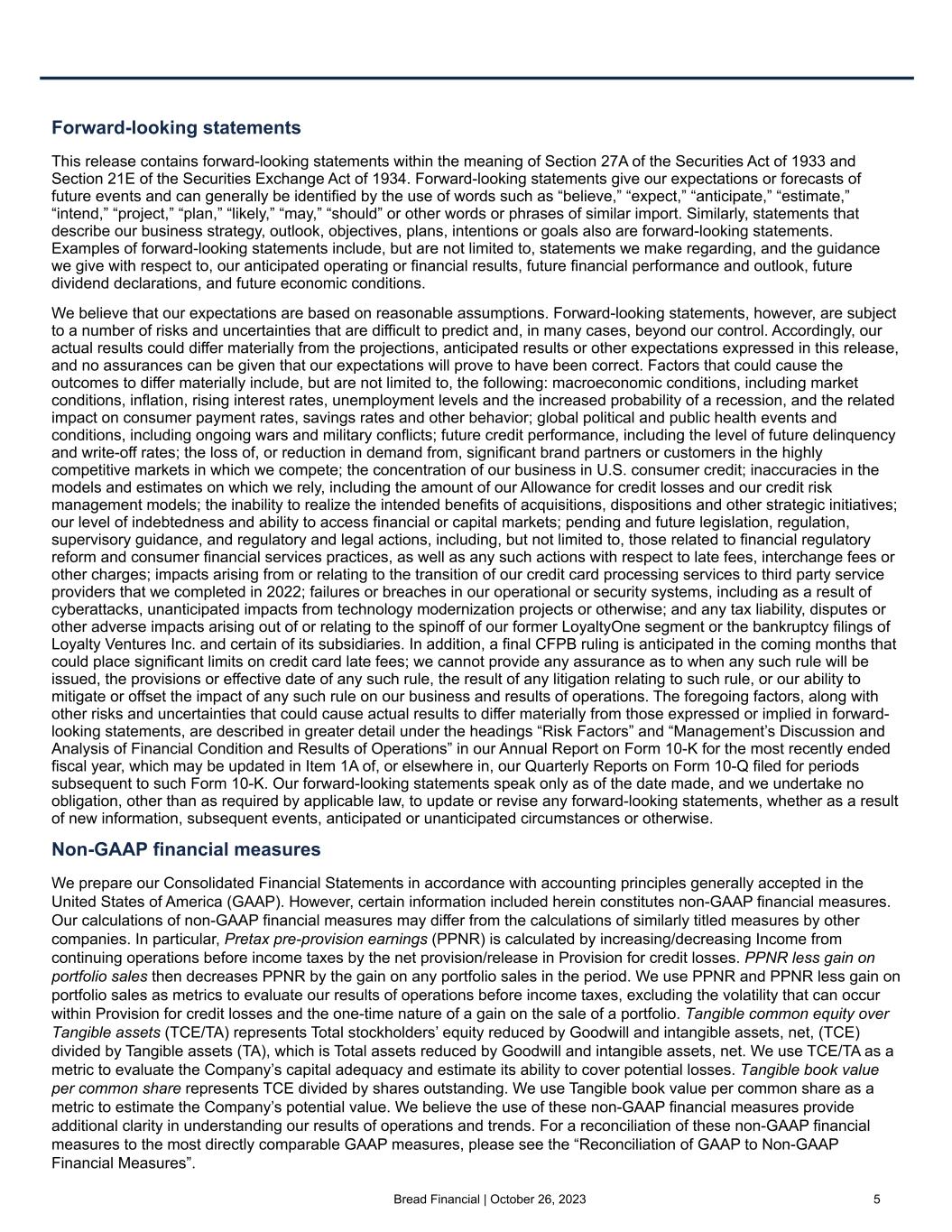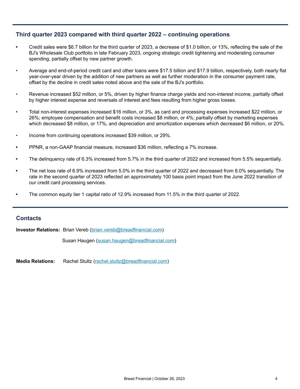Bread Financial | October 26, 2023 4 Third quarter 2023 compared with third quarter 2022 – continuing operations • Credit sales were $6.7 billion for the third quarter of 2023, a decrease of $1.0 billion, or 13%, reflecting the sale of the BJ's Wholesale Club portfolio in late February 2023, ongoing strategic credit tightening and moderating consumer spending, partially offset by new partner growth. • Average and end-of-period credit card and other loans were $17.5 billion and $17.9 billion, respectively, both nearly flat year-over-year driven by the addition of new partners as well as further moderation in the consumer payment rate, offset by the decline in credit sales noted above and the sale of the BJ's portfolio. • Revenue increased $52 million, or 5%, driven by higher finance charge yields and non-interest income, partially offset by higher interest expense and reversals of interest and fees resulting from higher gross losses. • Total non-interest expenses increased $16 million, or 3%, as card and processing expenses increased $22 million, or 26%; employee compensation and benefit costs increased $8 million, or 4%; partially offset by marketing expenses which decreased $8 million, or 17%; and depreciation and amortization expenses which decreased $6 million, or 20%. • Income from continuing operations increased $39 million, or 29%. • PPNR, a non-GAAP financial measure, increased $36 million, reflecting a 7% increase. • The delinquency rate of 6.3% increased from 5.7% in the third quarter of 2022 and increased from 5.5% sequentially. • The net loss rate of 6.9% increased from 5.0% in the third quarter of 2022 and decreased from 8.0% sequentially. The rate in the second quarter of 2023 reflected an approximately 100 basis point impact from the June 2022 transition of our credit card processing services. • The common equity tier 1 capital ratio of 12.9% increased from 11.5% in the third quarter of 2022. Contacts Investor Relations: Brian Vereb (brian.vereb@breadfinancial.com) Susan Haugen (susan.haugen@breadfinancial.com) Media Relations: Rachel Stultz (rachel.stultz@breadfinancial.com)