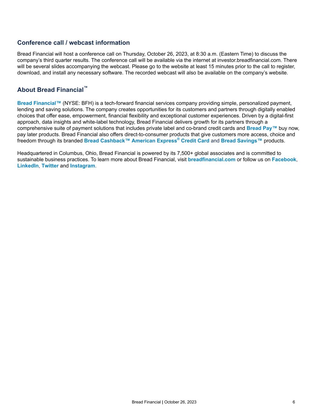 Bread Financial | October 26, 2023 6 Conference call / webcast information Bread Financial will host a conference call on Thursday, October 26, 2023, at 8:30 a.m. (Eastern Time) to discuss the company’s third quarter results. The conference call will be available via the internet at investor.breadfinancial.com. There will be several slides accompanying the webcast. Please go to the website at least 15 minutes prior to the call to register, download, and install any necessary software. The recorded webcast will also be available on the company’s website. About Bread Financial™ Bread Financial™ (NYSE: BFH) is a tech-forward financial services company providing simple, personalized payment, lending and saving solutions. The company creates opportunities for its customers and partners through digitally enabled choices that offer ease, empowerment, financial flexibility and exceptional customer experiences. Driven by a digital-first approach, data insights and white-label technology, Bread Financial delivers growth for its partners through a comprehensive suite of payment solutions that includes private label and co-brand credit cards and Bread Pay™ buy now, pay later products. Bread Financial also offers direct-to-consumer products that give customers more access, choice and freedom through its branded Bread Cashback™ American Express® Credit Card and Bread Savings™ products. Headquartered in Columbus, Ohio, Bread Financial is powered by its 7,500+ global associates and is committed to sustainable business practices. To learn more about Bread Financial, visit breadfinancial.com or follow us on Facebook, LinkedIn, Twitter and Instagram.