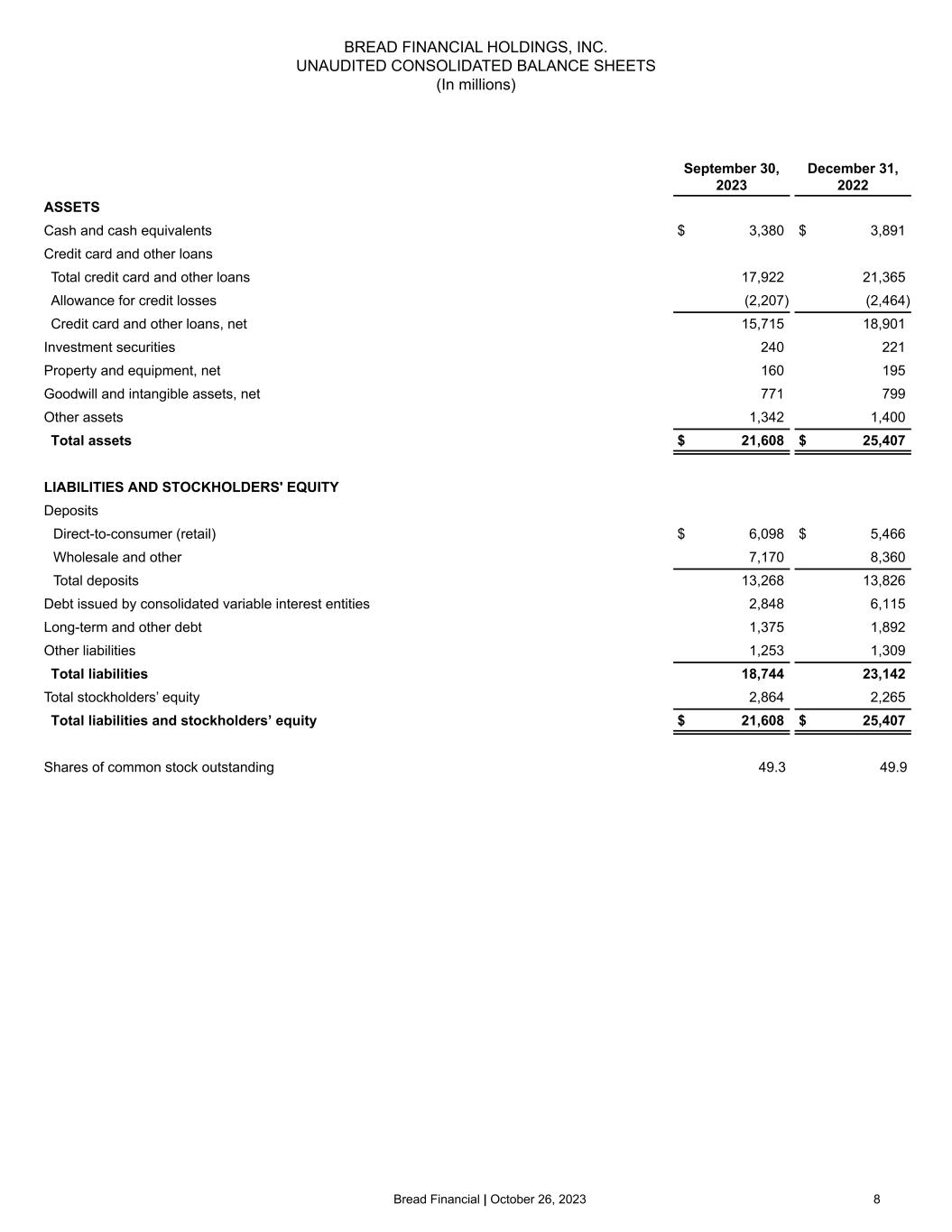 Bread Financial | October 26, 2023 7 Three months ended September 30, Nine months ended September 30, 2023 2022 2023 2022 Interest income Interest and fees on loans $ 1,256 $ 1,195 $ 3,697 $ 3,325 Interest on cash and investment securities 45 23 135 34 Total interest income 1,301 1,218 3,832 3,359 Interest expense Interest on deposits 143 66 387 142 Interest on borrowings 76 67 254 166 Total interest expense 219 133 641 308 Net interest income 1,082 1,085 3,191 3,051 Non-interest income Interchange revenue, net of retailer share arrangements (84) (136) (244) (333) Gain on portfolio sale — — 230 — Other 33 30 96 75 Total non-interest income (51) (106) 82 (258) Total net interest and non-interest income 1,031 979 3,273 2,793 Provision for credit losses 304 304 747 902 Total net interest and non-interest income, after provision for credit losses 727 675 2,526 1,891 Non-interest expenses Employee compensation and benefits 210 202 647 572 Card and processing expenses 104 82 339 248 Information processing and communication 73 75 222 192 Marketing expenses 36 44 115 124 Depreciation and amortization 23 29 92 80 Other 56 54 161 167 Total non-interest expenses 502 486 1,576 1,383 Income from continuing operations before income taxes 225 189 950 508 Provision for income taxes 52 55 257 150 Income from continuing operations 173 134 693 358 (Loss) income from discontinued operations, net of income taxes (2) — (18) (1) Net income $ 171 $ 134 $ 675 $ 357 Basic income per share Income from continuing operations $ 3.47 $ 2.69 $ 13.85 $ 7.17 (Loss) income from discontinued operations $ (0.03) $ — $ (0.37) $ (0.01) Net income per share $ 3.44 $ 2.69 $ 13.48 $ 7.16 Diluted income per share Income from continuing operations $ 3.46 $ 2.69 $ 13.80 $ 7.16 (Loss) income from discontinued operations $ (0.04) $ — $ (0.36) $ (0.01) Net income per share $ 3.42 $ 2.69 $ 13.44 $ 7.15 Weighted average common shares outstanding Basic 49.9 49.8 50.0 49.9 Diluted 50.1 49.9 50.2 50.0 Pretax pre-provision earnings (PPNR)* $ 529 $ 493 $ 1,697 $ 1,410 Less: Gain on portfolio sale — — (230) — PPNR less gain on portfolio sale* $ 529 $ 493 $ 1,467 $ 1,410 BREAD FINANCIAL HOLDINGS, INC. UNAUDITED CONSOLIDATED STATEMENTS OF INCOME (In millions, except per share amounts) * PPNR and PPNR less gain on portfolio sale are non-GAAP financial measures. See “Non-GAAP Financial Measures” and "Reconciliation of GAAP to Non-GAAP Financial Measures".