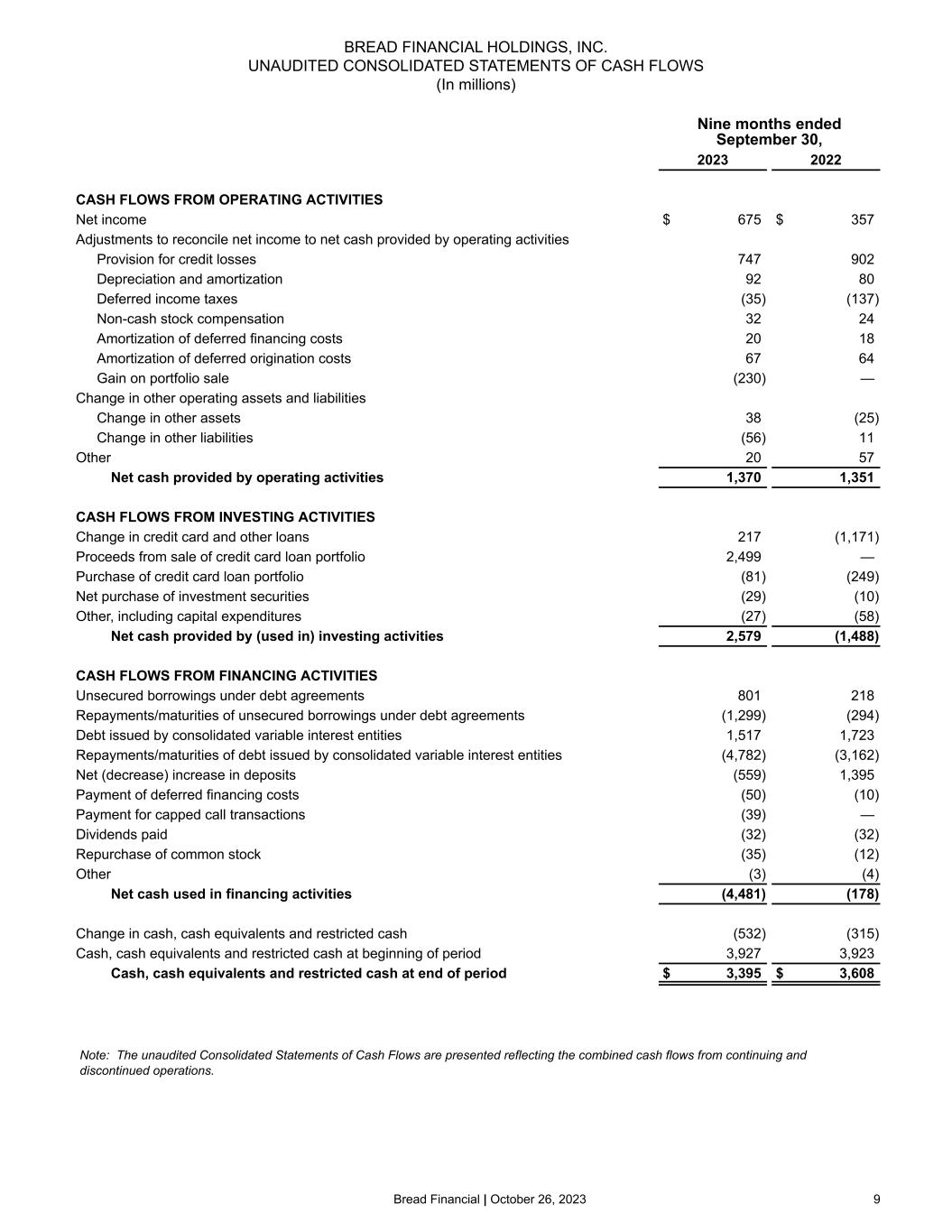 Bread Financial | October 26, 2023 8 BREAD FINANCIAL HOLDINGS, INC. UNAUDITED CONSOLIDATED BALANCE SHEETS (In millions) September 30, 2023 December 31, 2022 ASSETS Cash and cash equivalents $ 3,380 $ 3,891 Credit card and other loans Total credit card and other loans 17,922 21,365 Allowance for credit losses (2,207) (2,464) Credit card and other loans, net 15,715 18,901 Investment securities 240 221 Property and equipment, net 160 195 Goodwill and intangible assets, net 771 799 Other assets 1,342 1,400 Total assets $ 21,608 $ 25,407 LIABILITIES AND STOCKHOLDERS' EQUITY Deposits Direct-to-consumer (retail) $ 6,098 $ 5,466 Wholesale and other 7,170 8,360 Total deposits 13,268 13,826 Debt issued by consolidated variable interest entities 2,848 6,115 Long-term and other debt 1,375 1,892 Other liabilities 1,253 1,309 Total liabilities 18,744 23,142 Total stockholders’ equity 2,864 2,265 Total liabilities and stockholders’ equity $ 21,608 $ 25,407 Shares of common stock outstanding 49.3 49.9