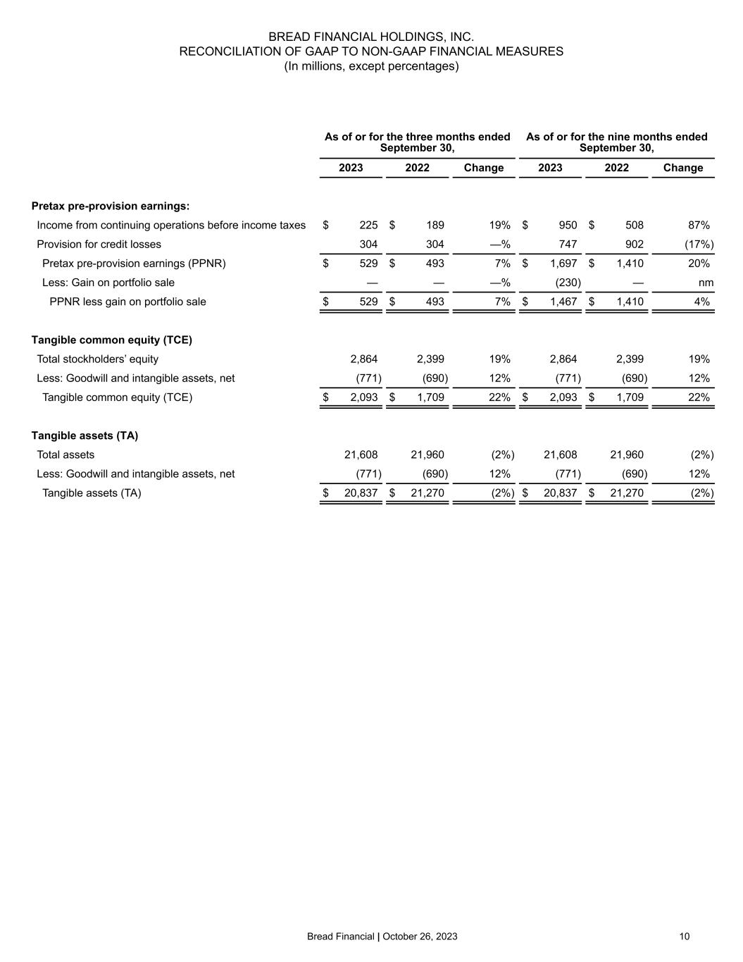 Bread Financial | October 26, 2023 9 Note: The unaudited Consolidated Statements of Cash Flows are presented reflecting the combined cash flows from continuing and discontinued operations. BREAD FINANCIAL HOLDINGS, INC. UNAUDITED CONSOLIDATED STATEMENTS OF CASH FLOWS (In millions) Nine months ended September 30, 2023 2022 CASH FLOWS FROM OPERATING ACTIVITIES Net income $ 675 $ 357 Adjustments to reconcile net income to net cash provided by operating activities Provision for credit losses 747 902 Depreciation and amortization 92 80 Deferred income taxes (35) (137) Non-cash stock compensation 32 24 Amortization of deferred financing costs 20 18 Amortization of deferred origination costs 67 64 Gain on portfolio sale (230) — Change in other operating assets and liabilities Change in other assets 38 (25) Change in other liabilities (56) 11 Other 20 57 Net cash provided by operating activities 1,370 1,351 CASH FLOWS FROM INVESTING ACTIVITIES Change in credit card and other loans 217 (1,171) Proceeds from sale of credit card loan portfolio 2,499 — Purchase of credit card loan portfolio (81) (249) Net purchase of investment securities (29) (10) Other, including capital expenditures (27) (58) Net cash provided by (used in) investing activities 2,579 (1,488) CASH FLOWS FROM FINANCING ACTIVITIES Unsecured borrowings under debt agreements 801 218 Repayments/maturities of unsecured borrowings under debt agreements (1,299) (294) Debt issued by consolidated variable interest entities 1,517 1,723 Repayments/maturities of debt issued by consolidated variable interest entities (4,782) (3,162) Net (decrease) increase in deposits (559) 1,395 Payment of deferred financing costs (50) (10) Payment for capped call transactions (39) — Dividends paid (32) (32) Repurchase of common stock (35) (12) Other (3) (4) Net cash used in financing activities (4,481) (178) Change in cash, cash equivalents and restricted cash (532) (315) Cash, cash equivalents and restricted cash at beginning of period 3,927 3,923 Cash, cash equivalents and restricted cash at end of period $ 3,395 $ 3,608