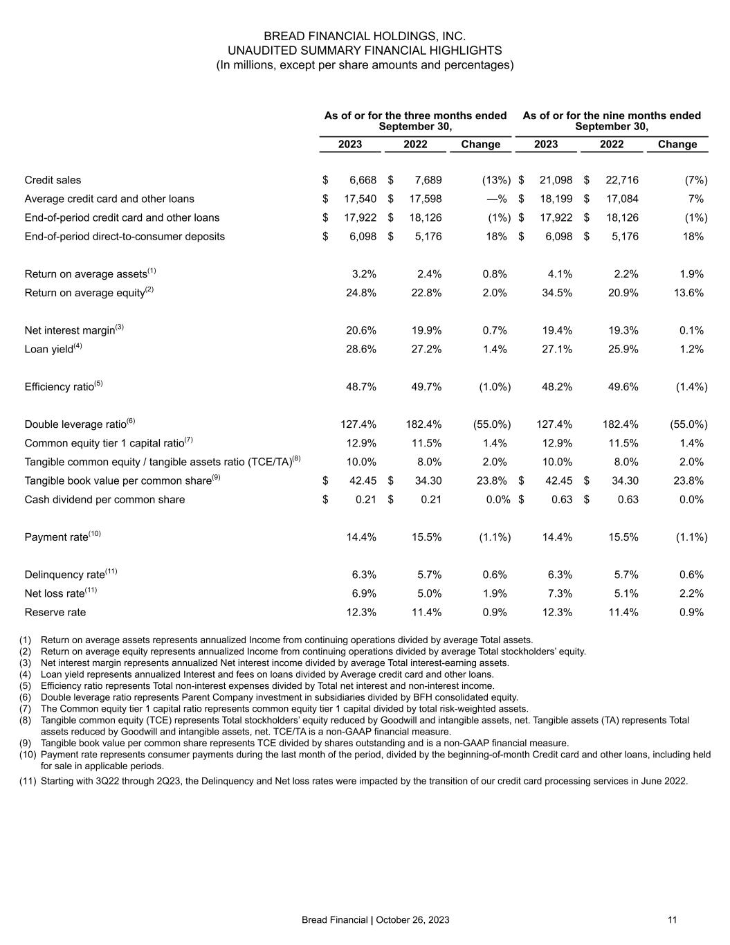 Bread Financial | October 26, 2023 10 BREAD FINANCIAL HOLDINGS, INC. RECONCILIATION OF GAAP TO NON-GAAP FINANCIAL MEASURES (In millions, except percentages) As of or for the three months ended September 30, As of or for the nine months ended September 30, 2023 2022 Change 2023 2022 Change Pretax pre-provision earnings: Income from continuing operations before income taxes $ 225 $ 189 19% $ 950 $ 508 87% Provision for credit losses 304 304 —% 747 902 (17%) Pretax pre-provision earnings (PPNR) $ 529 $ 493 7% $ 1,697 $ 1,410 20% Less: Gain on portfolio sale — — —% (230) — nm PPNR less gain on portfolio sale $ 529 $ 493 7% $ 1,467 $ 1,410 4% Tangible common equity (TCE) Total stockholders’ equity 2,864 2,399 19% 2,864 2,399 19% Less: Goodwill and intangible assets, net (771) (690) 12% (771) (690) 12% Tangible common equity (TCE) $ 2,093 $ 1,709 22% $ 2,093 $ 1,709 22% Tangible assets (TA) Total assets 21,608 21,960 (2%) 21,608 21,960 (2%) Less: Goodwill and intangible assets, net (771) (690) 12% (771) (690) 12% Tangible assets (TA) $ 20,837 $ 21,270 (2%) $ 20,837 $ 21,270 (2%)