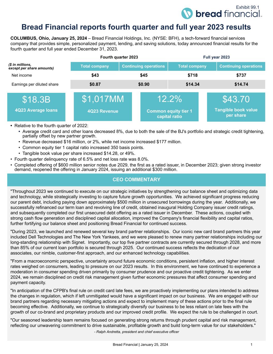 Bread Financial | January 25, 2024 1 "Throughout 2023 we continued to execute on our strategic initiatives by strengthening our balance sheet and optimizing data and technology, while strategically investing to capture future growth opportunities. We achieved significant progress reducing our parent debt, including paying down approximately $500 million in unsecured borrowings during the year. Additionally, we successfully refinanced our term loan and revolving line of credit, obtained inaugural Holding Company issuer credit ratings, and subsequently completed our first unsecured debt offering as a rated issuer in December. These actions, coupled with strong cash flow generation and disciplined capital allocation, improved the Company's financial flexibility and capital ratios, further fortifying our balance sheet and positioning Bread Financial for continued success. "During 2023, we launched and renewed several key brand partner relationships. Our iconic new card brand partners this year included Dell Technologies and The New York Yankees, and we were pleased to renew many partner relationships including our long-standing relationship with Signet. Importantly, our top five partner contracts are currently secured through 2028, and more than 85% of our current loan portfolio is secured through 2025. Our continued success reflects the dedication of our associates, our nimble, customer-first approach, and our enhanced technology capabilities. "From a macroeconomic perspective, uncertainty around future economic conditions, persistent inflation, and higher interest rates weighed on consumers, leading to pressure on our 2023 results. In this environment, we have continued to experience a moderation in consumer spending driven primarily by consumer prudence and our proactive credit tightening. As we enter 2024, we remain disciplined on credit risk management given further economic pressures that affect consumer spending and payment capacity. "In anticipation of the CFPB's final rule on credit card late fees, we are proactively implementing our plans intended to address the changes in regulation, which if left unmitigated would have a significant impact on our business. We are engaged with our brand partners regarding necessary mitigating actions and expect to implement many of these actions prior to the final rule becoming effective. Additionally, we continue to strategically diversify our business to be less reliant on late fees with the growth of our co-brand and proprietary products and our improved credit profile. We expect the rule to be challenged in court. "Our seasoned leadership team remains focused on generating strong returns through prudent capital and risk management, reflecting our unwavering commitment to drive sustainable, profitable growth and build long-term value for our stakeholders." - Ralph Andretta, president and chief executive officer Fourth quarter 2023 Full year 2023 ($ in millions, except per share amounts) Total company Continuing operations Total company Continuing operations Net income $43 $45 $718 $737 Earnings per diluted share $0.87 $0.90 $14.34 $14.74 Bread Financial reports fourth quarter and full year 2023 results CEO COMMENTARY COLUMBUS, Ohio, January 25, 2024 – Bread Financial Holdings, Inc. (NYSE: BFH), a tech-forward financial services company that provides simple, personalized payment, lending, and saving solutions, today announced financial results for the fourth quarter and full year ended December 31, 2023. • Relative to the fourth quarter of 2022: • Average credit card and other loans decreased 8%, due to both the sale of the BJ's portfolio and strategic credit tightening, partially offset by new partner growth. • Revenue decreased $16 million, or 2%, while net income increased $177 million. • Common equity tier 1 capital ratio increased 350 basis points. • Tangible book value per share increased $14.28, or 49%. • Fourth quarter delinquency rate of 6.5% and net loss rate was 8.0%. • Completed offering of $600 million senior notes due 2029, the first as a rated issuer, in December 2023; given strong investor demand, reopened the offering in January 2024, issuing an additional $300 million. $18.3B 4Q23 Average loans $1,017MM 4Q23 Revenue 12.2% Common equity tier 1 capital ratio $43.70 Tangible book value per share Exhibit 99.1