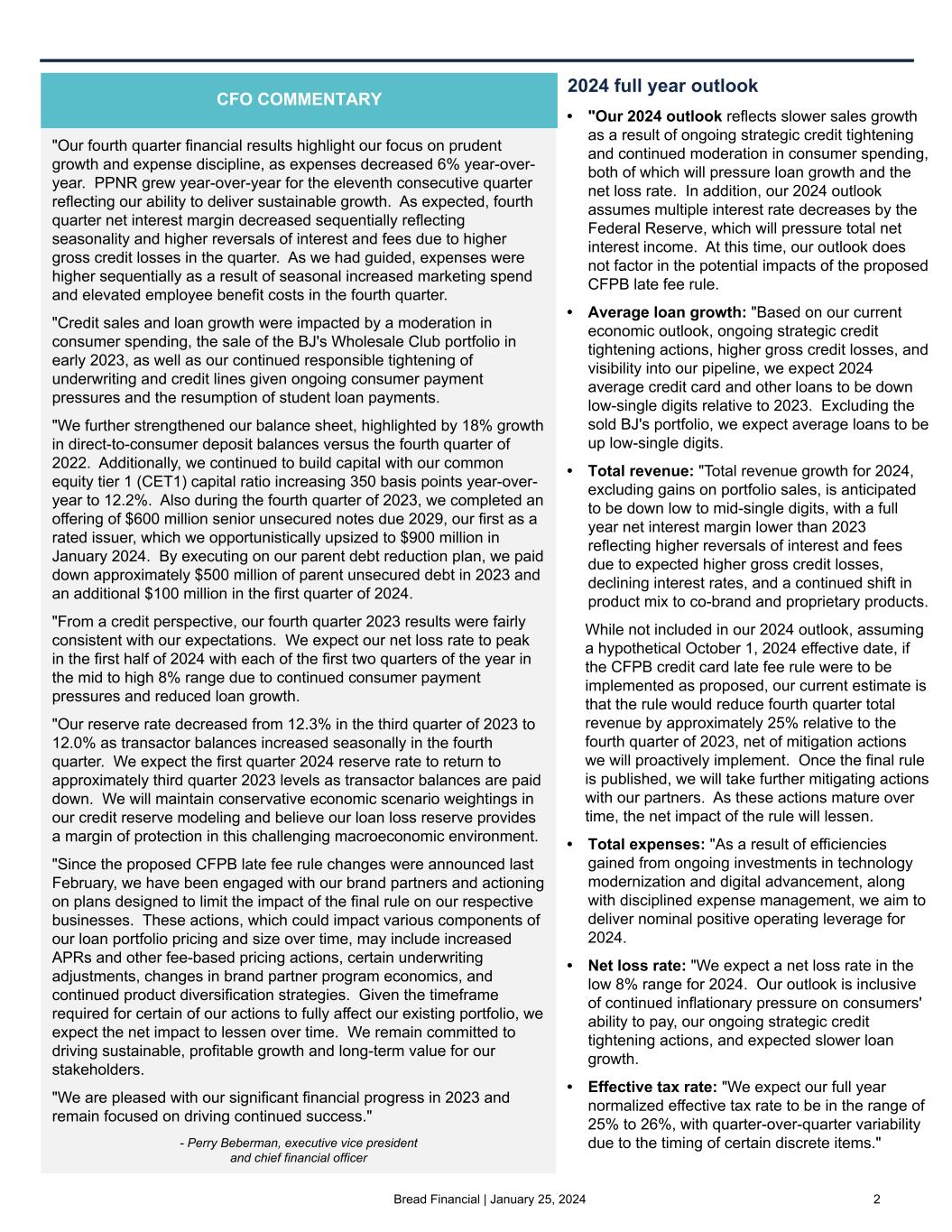 Bread Financial | January 25, 2024 2 "Our fourth quarter financial results highlight our focus on prudent growth and expense discipline, as expenses decreased 6% year-over- year. PPNR grew year-over-year for the eleventh consecutive quarter reflecting our ability to deliver sustainable growth. As expected, fourth quarter net interest margin decreased sequentially reflecting seasonality and higher reversals of interest and fees due to higher gross credit losses in the quarter. As we had guided, expenses were higher sequentially as a result of seasonal increased marketing spend and elevated employee benefit costs in the fourth quarter. "Credit sales and loan growth were impacted by a moderation in consumer spending, the sale of the BJ's Wholesale Club portfolio in early 2023, as well as our continued responsible tightening of underwriting and credit lines given ongoing consumer payment pressures and the resumption of student loan payments. "We further strengthened our balance sheet, highlighted by 18% growth in direct-to-consumer deposit balances versus the fourth quarter of 2022. Additionally, we continued to build capital with our common equity tier 1 (CET1) capital ratio increasing 350 basis points year-over- year to 12.2%. Also during the fourth quarter of 2023, we completed an offering of $600 million senior unsecured notes due 2029, our first as a rated issuer, which we opportunistically upsized to $900 million in January 2024. By executing on our parent debt reduction plan, we paid down approximately $500 million of parent unsecured debt in 2023 and an additional $100 million in the first quarter of 2024. "From a credit perspective, our fourth quarter 2023 results were fairly consistent with our expectations. We expect our net loss rate to peak in the first half of 2024 with each of the first two quarters of the year in the mid to high 8% range due to continued consumer payment pressures and reduced loan growth. "Our reserve rate decreased from 12.3% in the third quarter of 2023 to 12.0% as transactor balances increased seasonally in the fourth quarter. We expect the first quarter 2024 reserve rate to return to approximately third quarter 2023 levels as transactor balances are paid down. We will maintain conservative economic scenario weightings in our credit reserve modeling and believe our loan loss reserve provides a margin of protection in this challenging macroeconomic environment. "Since the proposed CFPB late fee rule changes were announced last February, we have been engaged with our brand partners and actioning on plans designed to limit the impact of the final rule on our respective businesses. These actions, which could impact various components of our loan portfolio pricing and size over time, may include increased APRs and other fee-based pricing actions, certain underwriting adjustments, changes in brand partner program economics, and continued product diversification strategies. Given the timeframe required for certain of our actions to fully affect our existing portfolio, we expect the net impact to lessen over time. We remain committed to driving sustainable, profitable growth and long-term value for our stakeholders. "We are pleased with our significant financial progress in 2023 and remain focused on driving continued success." - Perry Beberman, executive vice president and chief financial officer 2024 full year outlook • "Our 2024 outlook reflects slower sales growth as a result of ongoing strategic credit tightening and continued moderation in consumer spending, both of which will pressure loan growth and the net loss rate. In addition, our 2024 outlook assumes multiple interest rate decreases by the Federal Reserve, which will pressure total net interest income. At this time, our outlook does not factor in the potential impacts of the proposed CFPB late fee rule. • Average loan growth: "Based on our current economic outlook, ongoing strategic credit tightening actions, higher gross credit losses, and visibility into our pipeline, we expect 2024 average credit card and other loans to be down low-single digits relative to 2023. Excluding the sold BJ's portfolio, we expect average loans to be up low-single digits. • Total revenue: "Total revenue growth for 2024, excluding gains on portfolio sales, is anticipated to be down low to mid-single digits, with a full year net interest margin lower than 2023 reflecting higher reversals of interest and fees due to expected higher gross credit losses, declining interest rates, and a continued shift in product mix to co-brand and proprietary products. While not included in our 2024 outlook, assuming a hypothetical October 1, 2024 effective date, if the CFPB credit card late fee rule were to be implemented as proposed, our current estimate is that the rule would reduce fourth quarter total revenue by approximately 25% relative to the fourth quarter of 2023, net of mitigation actions we will proactively implement. Once the final rule is published, we will take further mitigating actions with our partners. As these actions mature over time, the net impact of the rule will lessen. • Total expenses: "As a result of efficiencies gained from ongoing investments in technology modernization and digital advancement, along with disciplined expense management, we aim to deliver nominal positive operating leverage for 2024. • Net loss rate: "We expect a net loss rate in the low 8% range for 2024. Our outlook is inclusive of continued inflationary pressure on consumers' ability to pay, our ongoing strategic credit tightening actions, and expected slower loan growth. • Effective tax rate: "We expect our full year normalized effective tax rate to be in the range of 25% to 26%, with quarter-over-quarter variability due to the timing of certain discrete items." CFO COMMENTARY