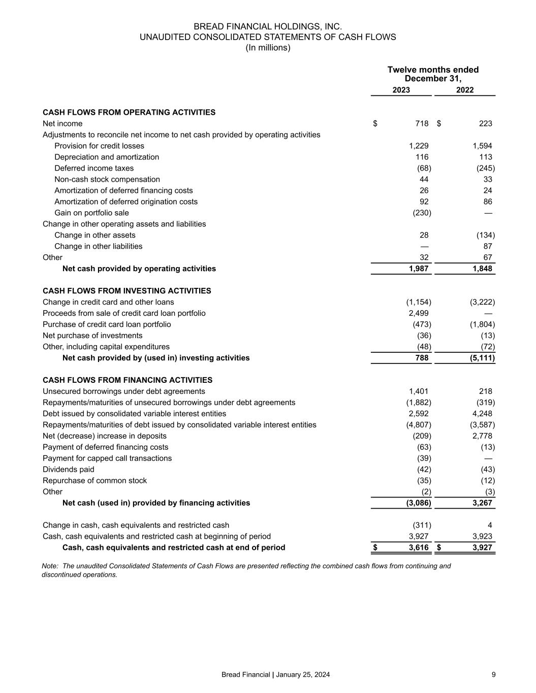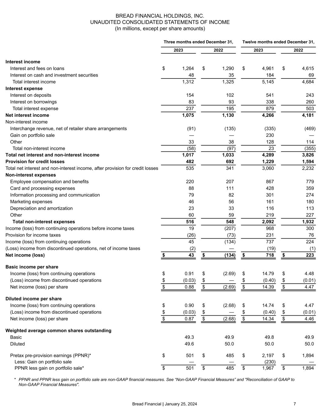 Bread Financial | January 25, 2024 7 Three months ended December 31, Twelve months ended December 31, 2023 2022 2023 2022 Interest income Interest and fees on loans $ 1,264 $ 1,290 $ 4,961 $ 4,615 Interest on cash and investment securities 48 35 184 69 Total interest income 1,312 1,325 5,145 4,684 Interest expense Interest on deposits 154 102 541 243 Interest on borrowings 83 93 338 260 Total interest expense 237 195 879 503 Net interest income 1,075 1,130 4,266 4,181 Non-interest income Interchange revenue, net of retailer share arrangements (91) (135) (335) (469) Gain on portfolio sale — — 230 — Other 33 38 128 114 Total non-interest income (58) (97) 23 (355) Total net interest and non-interest income 1,017 1,033 4,289 3,826 Provision for credit losses 482 692 1,229 1,594 Total net interest and non-interest income, after provision for credit losses 535 341 3,060 2,232 Non-interest expenses Employee compensation and benefits 220 207 867 779 Card and processing expenses 88 111 428 359 Information processing and communication 79 82 301 274 Marketing expenses 46 56 161 180 Depreciation and amortization 23 33 116 113 Other 60 59 219 227 Total non-interest expenses 516 548 2,092 1,932 Income (loss) from continuing operations before income taxes 19 (207) 968 300 Provision for income taxes (26) (73) 231 76 Income (loss) from continuing operations 45 (134) 737 224 (Loss) income from discontinued operations, net of income taxes (2) — (19) (1) Net income (loss) $ 43 $ (134) $ 718 $ 223 Basic income per share Income (loss) from continuing operations $ 0.91 $ (2.69) $ 14.79 $ 4.48 (Loss) income from discontinued operations $ (0.03) $ — $ (0.40) $ (0.01) Net income (loss) per share $ 0.88 $ (2.69) $ 14.39 $ 4.47 Diluted income per share Income (loss) from continuing operations $ 0.90 $ (2.68) $ 14.74 $ 4.47 (Loss) income from discontinued operations $ (0.03) $ — $ (0.40) $ (0.01) Net income (loss) per share $ 0.87 $ (2.68) $ 14.34 $ 4.46 Weighted average common shares outstanding Basic 49.3 49.9 49.8 49.9 Diluted 49.6 50.0 50.0 50.0 Pretax pre-provision earnings (PPNR)* $ 501 $ 485 $ 2,197 $ 1,894 Less: Gain on portfolio sale — — (230) — PPNR less gain on portfolio sale* $ 501 $ 485 $ 1,967 $ 1,894 BREAD FINANCIAL HOLDINGS, INC. UNAUDITED CONSOLIDATED STATEMENTS OF INCOME (In millions, except per share amounts) * PPNR and PPNR less gain on portfolio sale are non-GAAP financial measures. See “Non-GAAP Financial Measures” and "Reconciliation of GAAP to Non-GAAP Financial Measures".