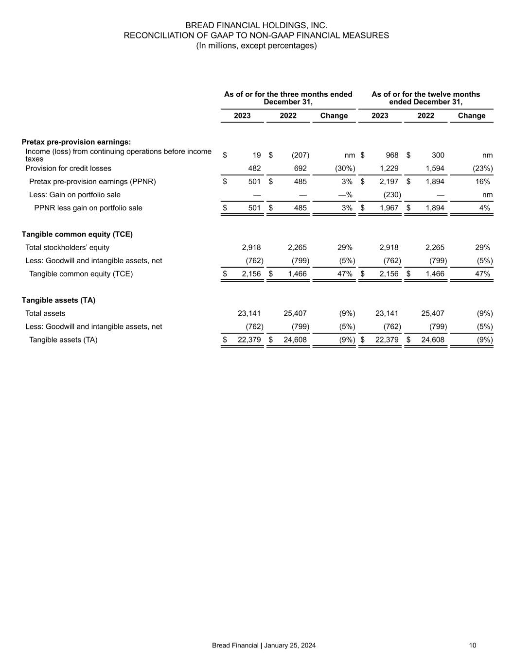 Bread Financial | January 25, 2024 9 Note: The unaudited Consolidated Statements of Cash Flows are presented reflecting the combined cash flows from continuing and discontinued operations. BREAD FINANCIAL HOLDINGS, INC. UNAUDITED CONSOLIDATED STATEMENTS OF CASH FLOWS (In millions) Twelve months ended December 31, 2023 2022 CASH FLOWS FROM OPERATING ACTIVITIES Net income $ 718 $ 223 Adjustments to reconcile net income to net cash provided by operating activities Provision for credit losses 1,229 1,594 Depreciation and amortization 116 113 Deferred income taxes (68) (245) Non-cash stock compensation 44 33 Amortization of deferred financing costs 26 24 Amortization of deferred origination costs 92 86 Gain on portfolio sale (230) — Change in other operating assets and liabilities Change in other assets 28 (134) Change in other liabilities — 87 Other 32 67 Net cash provided by operating activities 1,987 1,848 CASH FLOWS FROM INVESTING ACTIVITIES Change in credit card and other loans (1,154) (3,222) Proceeds from sale of credit card loan portfolio 2,499 — Purchase of credit card loan portfolio (473) (1,804) Net purchase of investments (36) (13) Other, including capital expenditures (48) (72) Net cash provided by (used in) investing activities 788 (5,111) CASH FLOWS FROM FINANCING ACTIVITIES Unsecured borrowings under debt agreements 1,401 218 Repayments/maturities of unsecured borrowings under debt agreements (1,882) (319) Debt issued by consolidated variable interest entities 2,592 4,248 Repayments/maturities of debt issued by consolidated variable interest entities (4,807) (3,587) Net (decrease) increase in deposits (209) 2,778 Payment of deferred financing costs (63) (13) Payment for capped call transactions (39) — Dividends paid (42) (43) Repurchase of common stock (35) (12) Other (2) (3) Net cash (used in) provided by financing activities (3,086) 3,267 Change in cash, cash equivalents and restricted cash (311) 4 Cash, cash equivalents and restricted cash at beginning of period 3,927 3,923 Cash, cash equivalents and restricted cash at end of period $ 3,616 $ 3,927
