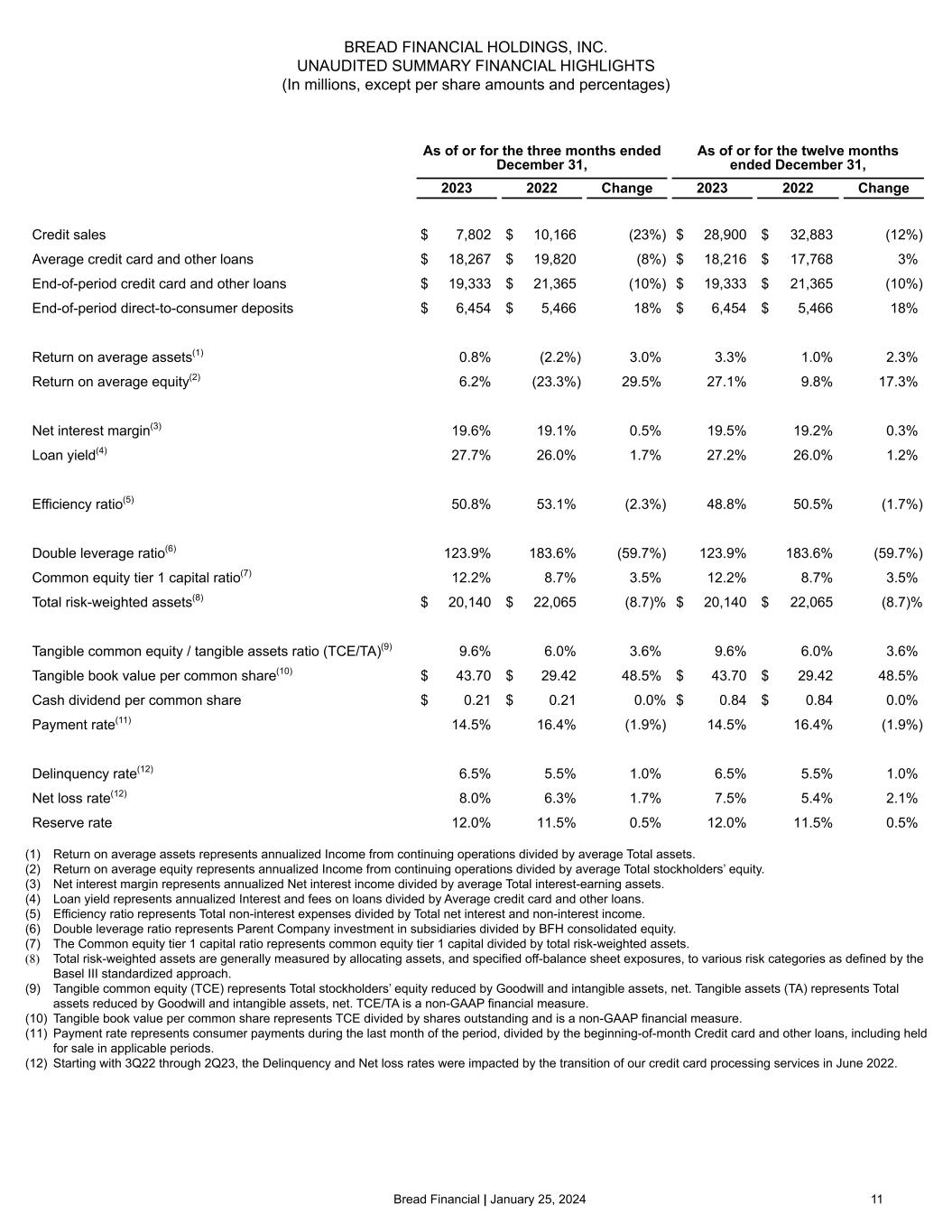 Bread Financial | January 25, 2024 10 BREAD FINANCIAL HOLDINGS, INC. RECONCILIATION OF GAAP TO NON-GAAP FINANCIAL MEASURES (In millions, except percentages) As of or for the three months ended December 31, As of or for the twelve months ended December 31, 2023 2022 Change 2023 2022 Change Pretax pre-provision earnings: Income (loss) from continuing operations before income taxes $ 19 $ (207) nm $ 968 $ 300 nm Provision for credit losses 482 692 (30%) 1,229 1,594 (23%) Pretax pre-provision earnings (PPNR) $ 501 $ 485 3% $ 2,197 $ 1,894 16% Less: Gain on portfolio sale — — —% (230) — nm PPNR less gain on portfolio sale $ 501 $ 485 3% $ 1,967 $ 1,894 4% Tangible common equity (TCE) Total stockholders’ equity 2,918 2,265 29% 2,918 2,265 29% Less: Goodwill and intangible assets, net (762) (799) (5%) (762) (799) (5%) Tangible common equity (TCE) $ 2,156 $ 1,466 47% $ 2,156 $ 1,466 47% Tangible assets (TA) Total assets 23,141 25,407 (9%) 23,141 25,407 (9%) Less: Goodwill and intangible assets, net (762) (799) (5%) (762) (799) (5%) Tangible assets (TA) $ 22,379 $ 24,608 (9%) $ 22,379 $ 24,608 (9%)