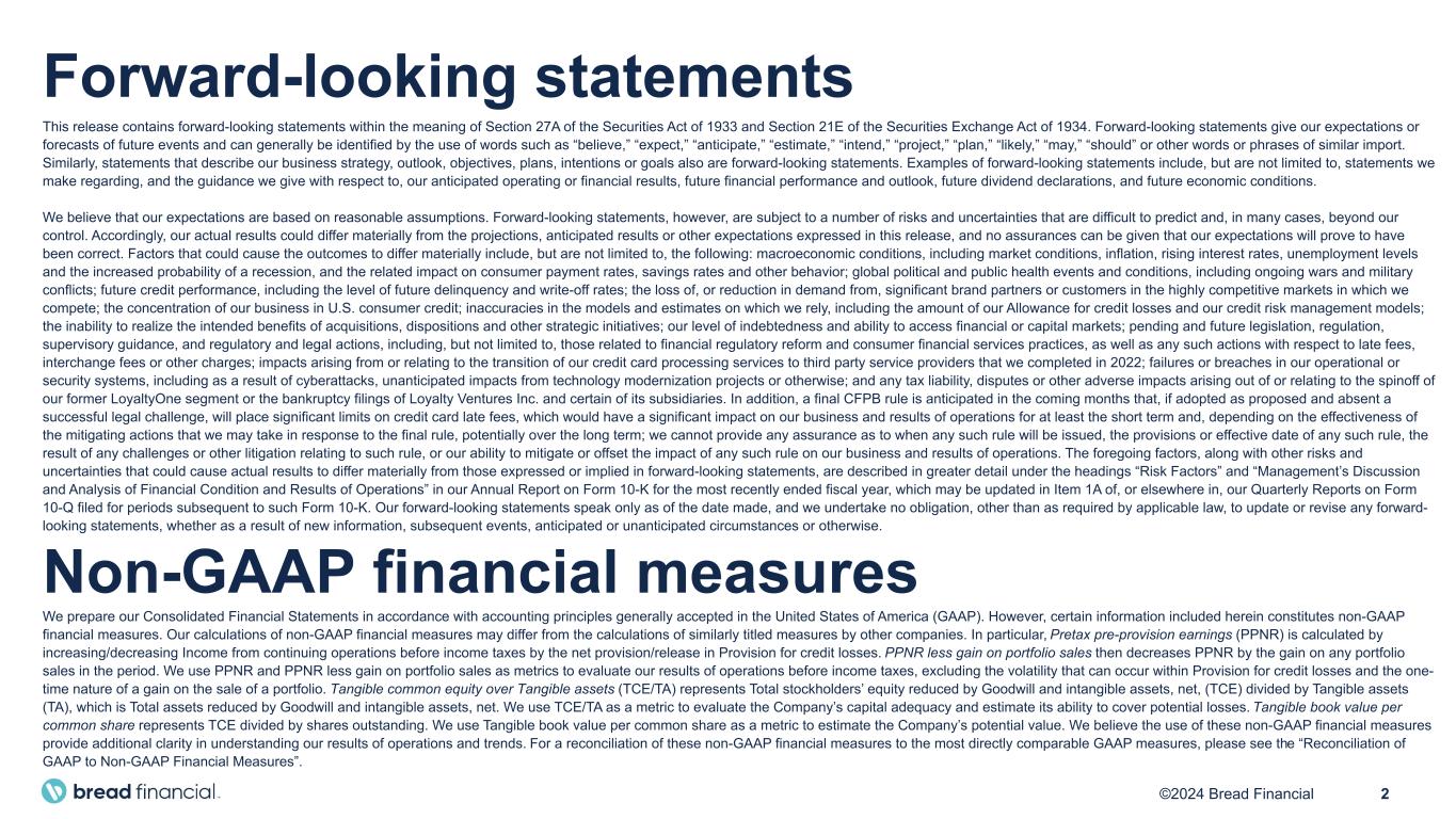2©2024 Bread Financial Forward-looking statements This release contains forward-looking statements within the meaning of Section 27A of the Securities Act of 1933 and Section 21E of the Securities Exchange Act of 1934. Forward-looking statements give our expectations or forecasts of future events and can generally be identified by the use of words such as “believe,” “expect,” “anticipate,” “estimate,” “intend,” “project,” “plan,” “likely,” “may,” “should” or other words or phrases of similar import. Similarly, statements that describe our business strategy, outlook, objectives, plans, intentions or goals also are forward-looking statements. Examples of forward-looking statements include, but are not limited to, statements we make regarding, and the guidance we give with respect to, our anticipated operating or financial results, future financial performance and outlook, future dividend declarations, and future economic conditions. We believe that our expectations are based on reasonable assumptions. Forward-looking statements, however, are subject to a number of risks and uncertainties that are difficult to predict and, in many cases, beyond our control. Accordingly, our actual results could differ materially from the projections, anticipated results or other expectations expressed in this release, and no assurances can be given that our expectations will prove to have been correct. Factors that could cause the outcomes to differ materially include, but are not limited to, the following: macroeconomic conditions, including market conditions, inflation, rising interest rates, unemployment levels and the increased probability of a recession, and the related impact on consumer payment rates, savings rates and other behavior; global political and public health events and conditions, including ongoing wars and military conflicts; future credit performance, including the level of future delinquency and write-off rates; the loss of, or reduction in demand from, significant brand partners or customers in the highly competitive markets in which we compete; the concentration of our business in U.S. consumer credit; inaccuracies in the models and estimates on which we rely, including the amount of our Allowance for credit losses and our credit risk management models; the inability to realize the intended benefits of acquisitions, dispositions and other strategic initiatives; our level of indebtedness and ability to access financial or capital markets; pending and future legislation, regulation, supervisory guidance, and regulatory and legal actions, including, but not limited to, those related to financial regulatory reform and consumer financial services practices, as well as any such actions with respect to late fees, interchange fees or other charges; impacts arising from or relating to the transition of our credit card processing services to third party service providers that we completed in 2022; failures or breaches in our operational or security systems, including as a result of cyberattacks, unanticipated impacts from technology modernization projects or otherwise; and any tax liability, disputes or other adverse impacts arising out of or relating to the spinoff of our former LoyaltyOne segment or the bankruptcy filings of Loyalty Ventures Inc. and certain of its subsidiaries. In addition, a final CFPB rule is anticipated in the coming months that, if adopted as proposed and absent a successful legal challenge, will place significant limits on credit card late fees, which would have a significant impact on our business and results of operations for at least the short term and, depending on the effectiveness of the mitigating actions that we may take in response to the final rule, potentially over the long term; we cannot provide any assurance as to when any such rule will be issued, the provisions or effective date of any such rule, the result of any challenges or other litigation relating to such rule, or our ability to mitigate or offset the impact of any such rule on our business and results of operations. The foregoing factors, along with other risks and uncertainties that could cause actual results to differ materially from those expressed or implied in forward-looking statements, are described in greater detail under the headings “Risk Factors” and “Management’s Discussion and Analysis of Financial Condition and Results of Operations” in our Annual Report on Form 10-K for the most recently ended fiscal year, which may be updated in Item 1A of, or elsewhere in, our Quarterly Reports on Form 10-Q filed for periods subsequent to such Form 10-K. Our forward-looking statements speak only as of the date made, and we undertake no obligation, other than as required by applicable law, to update or revise any forward- looking statements, whether as a result of new information, subsequent events, anticipated or unanticipated circumstances or otherwise. Non-GAAP financial measures We prepare our Consolidated Financial Statements in accordance with accounting principles generally accepted in the United States of America (GAAP). However, certain information included herein constitutes non-GAAP financial measures. Our calculations of non-GAAP financial measures may differ from the calculations of similarly titled measures by other companies. In particular, Pretax pre-provision earnings (PPNR) is calculated by increasing/decreasing Income from continuing operations before income taxes by the net provision/release in Provision for credit losses. PPNR less gain on portfolio sales then decreases PPNR by the gain on any portfolio sales in the period. We use PPNR and PPNR less gain on portfolio sales as metrics to evaluate our results of operations before income taxes, excluding the volatility that can occur within Provision for credit losses and the one- time nature of a gain on the sale of a portfolio. Tangible common equity over Tangible assets (TCE/TA