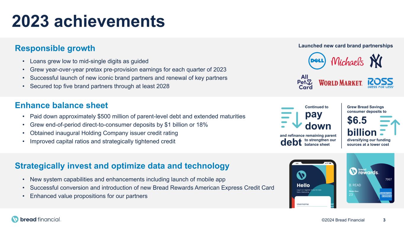 2©2024 Bread Financial Forward-looking statements This release contains forward-looking statements within the meaning of Section 27A of the Securities Act of 1933 and Section 21E of the Securities Exchange Act of 1934. Forward-looking statements give our expectations or forecasts of future events and can generally be identified by the use of words such as “believe,” “expect,” “anticipate,” “estimate,” “intend,” “project,” “plan,” “likely,” “may,” “should” or other words or phrases of similar import. Similarly, statements that describe our business strategy, outlook, objectives, plans, intentions or goals also are forward-looking statements. Examples of forward-looking statements include, but are not limited to, statements we make regarding, and the guidance we give with respect to, our anticipated operating or financial results, future financial performance and outlook, future dividend declarations, and future economic conditions. We believe that our expectations are based on reasonable assumptions. Forward-looking statements, however, are subject to a number of risks and uncertainties that are difficult to predict and, in many cases, beyond our control. Accordingly, our actual results could differ materially from the projections, anticipated results or other expectations expressed in this release, and no assurances can be given that our expectations will prove to have been correct. Factors that could cause the outcomes to differ materially include, but are not limited to, the following: macroeconomic conditions, including market conditions, inflation, rising interest rates, unemployment levels and the increased probability of a recession, and the related impact on consumer payment rates, savings rates and other behavior; global political and public health events and conditions, including ongoing wars and military conflicts; future credit performance, including the level of future delinquency and write-off rates; the loss of, or reduction in demand from, significant brand partners or customers in the highly competitive markets in which we compete; the concentration of our business in U.S. consumer credit; inaccuracies in the models and estimates on which we rely, including the amount of our Allowance for credit losses and our credit risk management models; the inability to realize the intended benefits of acquisitions, dispositions and other strategic initiatives; our level of indebtedness and ability to access financial or capital markets; pending and future legislation, regulation, supervisory guidance, and regulatory and legal actions, including, but not limited to, those related to financial regulatory reform and consumer financial services practices, as well as any such actions with respect to late fees, interchange fees or other charges; impacts arising from or relating to the transition of our credit card processing services to third party service providers that we completed in 2022; failures or breaches in our operational or security systems, including as a result of cyberattacks, unanticipated impacts from technology modernization projects or otherwise; and any tax liability, disputes or other adverse impacts arising out of or relating to the spinoff of our former LoyaltyOne segment or the bankruptcy filings of Loyalty Ventures Inc. and certain of its subsidiaries. In addition, a final CFPB rule is anticipated in the coming months that, if adopted as proposed and absent a successful legal challenge, will place significant limits on credit card late fees, which would have a significant impact on our business and results of operations for at least the short term and, depending on the effectiveness of the mitigating actions that we may take in response to the final rule, potentially over the long term; we cannot provide any assurance as to when any such rule will be issued, the provisions or effective date of any such rule, the result of any challenges or other litigation relating to such rule, or our ability to mitigate or offset the impact of any such rule on our business and results of operations. The foregoing factors, along with other risks and uncertainties that could cause actual results to differ materially from those expressed or implied in forward-looking statements, are described in greater detail under the headings “Risk Factors” and “Management’s Discussion and Analysis of Financial Condition and Results of Operations” in our Annual Report on Form 10-K for the most recently ended fiscal year, which may be updated in Item 1A of, or elsewhere in, our Quarterly Reports on Form 10-Q filed for periods subsequent to such Form 10-K. Our forward-looking statements speak only as of the date made, and we undertake no obligation, other than as required by applicable law, to update or revise any forward- looking statements, whether as a result of new information, subsequent events, anticipated or unanticipated circumstances or otherwise. Non-GAAP financial measures We prepare our Consolidated Financial Statements in accordance with accounting principles generally accepted in the United States of America (GAAP). However, certain information included herein constitutes non-GAAP financial measures. Our calculations of non-GAAP financial measures may differ from the calculations of similarly titled measures by other companies. In particular, Pretax pre-provision earnings (PPNR) is calculated by increasing/decreasing Income from continuing operations before income taxes by the net provision/release in Provision for credit losses. PPNR less gain on portfolio sales then decreases PPNR by the gain on any portfolio sales in the period. We use PPNR and PPNR less gain on portfolio sales as metrics to evaluate our results of operations before income taxes, excluding the volatility that can occur within Provision for credit losses and the one- time nature of a gain on the sale of a portfolio. Tangible common equity over Tangible assets (TCE/TA
