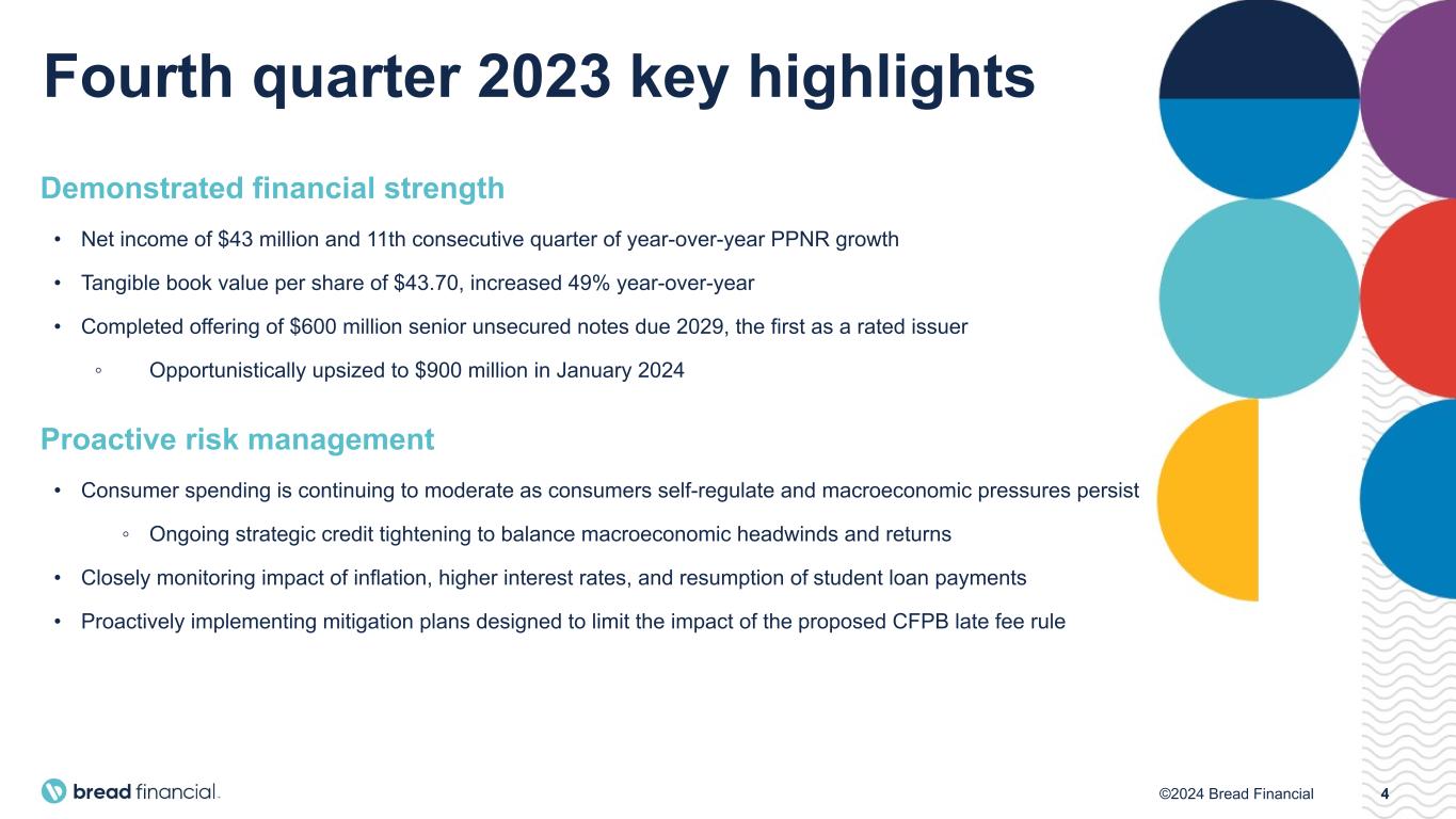 3©2024 Bread Financial 2023 achievements Responsible growth Enhance balance sheet Strategically invest and optimize data and technology • Loans grew low to mid-single digits as guided • Grew year-over-year pretax pre-provision earnings for each quarter of 2023 • Successful launch of new iconic brand partners and renewal of key partners • Secured top five brand partners through at least 2028 • Paid down approximately $500 million of parent-level debt and extended maturities • Grew end-of-period direct-to-consumer deposits by $1 billion or 18% • Obtained inaugural Holding Company issuer credit rating • Improved capital ratios and strategically tightened credit • New system capabilities and enhancements including launch of mobile app • Successful conversion and introduction of new Bread Rewards American Express Credit Card • Enhanced value propositions for our partners Launched new card brand partnerships Continued to pay down and refinance remaining parent to strengthen our balance sheetdebt Grew Bread Savings consumer deposits to $6.5 billion diversifying our funding sources at a lower cost