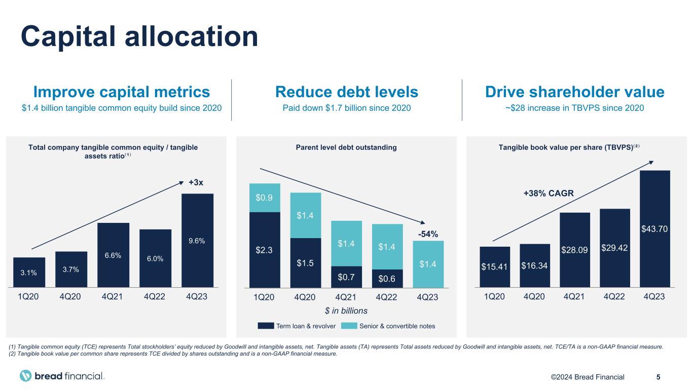 4©2024 Bread Financial Fourth quarter 2023 key highlights Demonstrated financial strength • Net income of $43 million and 11th consecutive quarter of year-over-year PPNR growth • Tangible book value per share of $43.70, increased 49% year-over-year • Completed offering of $600 million senior unsecured notes due 2029, the first as a rated issuer ◦ Opportunistically upsized to $900 million in January 2024 Proactive risk management • Consumer spending is continuing to moderate as consumers self-regulate and macroeconomic pressures persist ◦ Ongoing strategic credit tightening to balance macroeconomic headwinds and returns • Closely monitoring impact of inflation, higher interest rates, and resumption of student loan payments • Proactively implementing mitigation plans designed to limit the impact of the proposed CFPB late fee rule