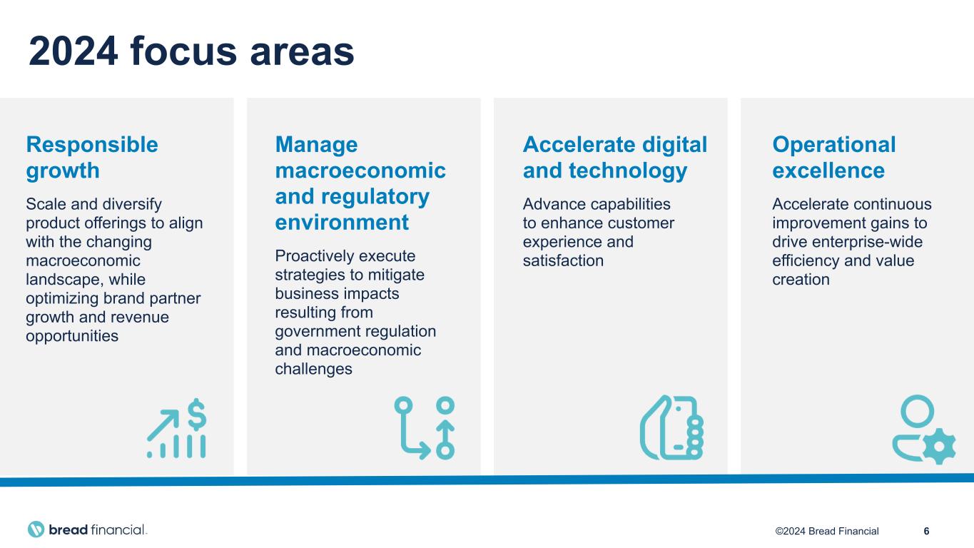 5©2024 Bread Financial $ in billions Parent level debt outstanding $2.3 $1.5 $0.7 $0.6 $0.9 $1.4 $1.4 $1.4 $1.4 Term loan & revolver Senior & convertible notes 1Q20 4Q20 4Q21 4Q22 4Q23 (1) Tangible common equity (TCE) represents Total stockholders’ equity reduced by Goodwill and intangible assets, net. Tangible assets (TA) represents Total assets reduced by Goodwill and intangible assets, net. TCE/TA is a non-GAAP financial measure. (2) Tangible book value per common share represents TCE divided by shares outstanding and is a non-GAAP financial measure. Capital allocation Tangible book value per share (TBVPS)⁽²⁾ $15.41 $16.34 $28.09 $29.42 $43.70 1Q20 4Q20 4Q21 4Q22 4Q23 Total company tangible common equity / tangible assets ratio⁽¹⁾ 3.1% 3.7% 6.6% 6.0% 9.6% 1Q20 4Q20 4Q21 4Q22 4Q23 +3x +38% CAGR Drive shareholder valueImprove capital metrics -54% Reduce debt levels $1.4 billion tangible common equity build since 2020 ~$28 increase in TBVPS since 2020Paid down $1.7 billion since 2020
