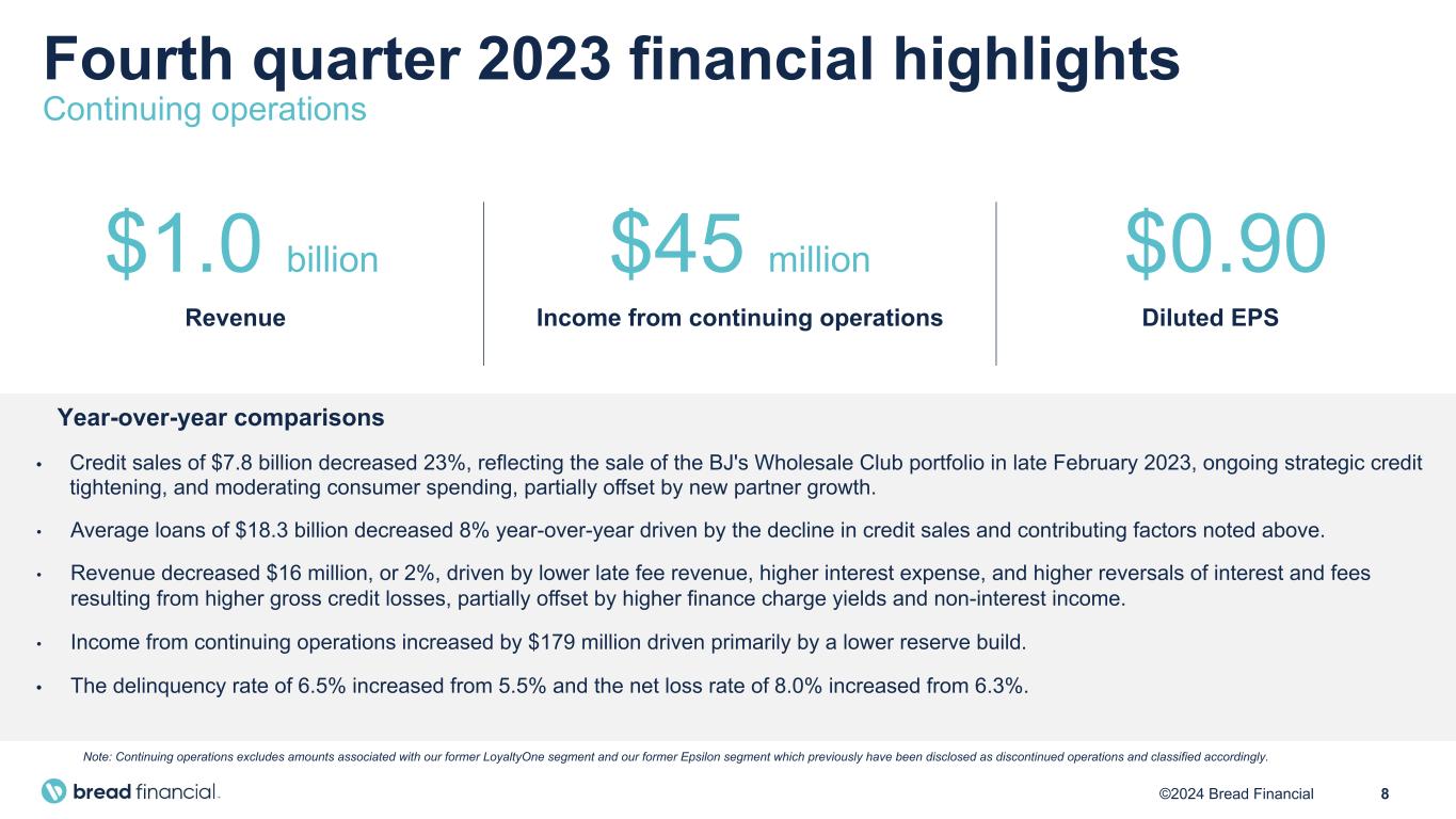 7©2024 Bread Financial Full year 2023 financial highlights Continuing operations $4.3 billion Revenue $737 million Income from continuing operations $14.74 Diluted EPS Year-over-year comparisons • Credit sales of $28.9 billion decreased 12%, reflecting the sale of the BJ's Wholesale Club portfolio in late February 2023, ongoing strategic credit tightening and moderating consumer spending, partially offset by new partner growth. • Average loans of $18.2 billion increased 3% year-over-year driven by the addition of new partners as well as further moderation in the consumer payment rate, offset by the decline in credit sales noted above and the sale of the BJ's portfolio. • Revenue increased $463 million, or 12%, driven by higher finance charge yields and non-interest income, including the gain on portfolio sale, partially offset by higher interest expense, and reversals of interest and fees resulting from higher gross credit losses. • Income from continuing operations increased $513 million to $737 million driven by a lower provision for credit losses and the gain on portfolio sale, partially offset by higher income taxes. • The delinquency rate of 6.5% increased from 5.5% and the net loss rate of 7.5% increased from 5.4%. Note: Continuing operations excludes amounts associated with our former LoyaltyOne segment and our former Epsilon segment which previously have been disclosed as discontinued operations and classified accordingly.