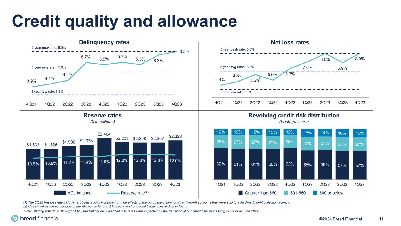 10©2024 Bread Financial $17.4 $17.8 $18.2 $18.8 $20.3 $19.9 $17.8 $17.5 $18.1 Wholesale deposits Direct-to-consumer deposits Unsecured borrowings Secured borrowings 4Q21 1Q22 2Q22 3Q22 4Q22 1Q23 2Q23 3Q23 4Q23 $19.8 $20.4 $21.0 $21.8 $23.6 $23.5 $21.3 $21.0 $21.9 Credit card and other loans Cash and investment securities 4Q21 1Q22 2Q22 3Q22 4Q22 1Q23 2Q23 3Q23 4Q23 Av er ag e in te re st -b ea rin g lia bi lit ie s ($ in b ill io ns ) Av er ag e in te re st -e ar ni ng a ss et s ($ in b ill io ns ) Interest-earning asset yields & mix 25.2% 25.6% 25.0% 27.2% 26.0% 26.6% 26.1% 28.6% 27.7% 20.6% 20.9% 20.5% 22.3% 22.4% 22.7% 22.5% 24.8% 23.9% 18.8% 19.4% 18.6% 19.9% 19.1% 19.0% 18.7% 20.6% 19.6% Loan yield Avg. earning asset yield Net interest margin Interest-bearing liability costs & funding mix 1.9% 1.8% 2.1% 2.8% 3.9% 4.4% 4.6% 5.0% 5.2% 1.4% 1.3% 1.5% 2.2% 3.1% 3.5% 3.9% 4.3% 4.6% Cost of total interest-bearing liabilities Cost of deposits Net interest margin 81% 81% 81% 81% 84% 83% 83% 83% 83% 19% 19% 19% 19% 16% 17% 17% 17% 17% 26% 28% 29% 26% 25% 23% 16% 17% 18% 14% 11% 11% 10% 10% 9% 10% 8% 8% 18% 19% 22% 27% 26% 28% 33% 35% 35% 42% 42% 38% 37% 39% 40% 41% 40% 39%