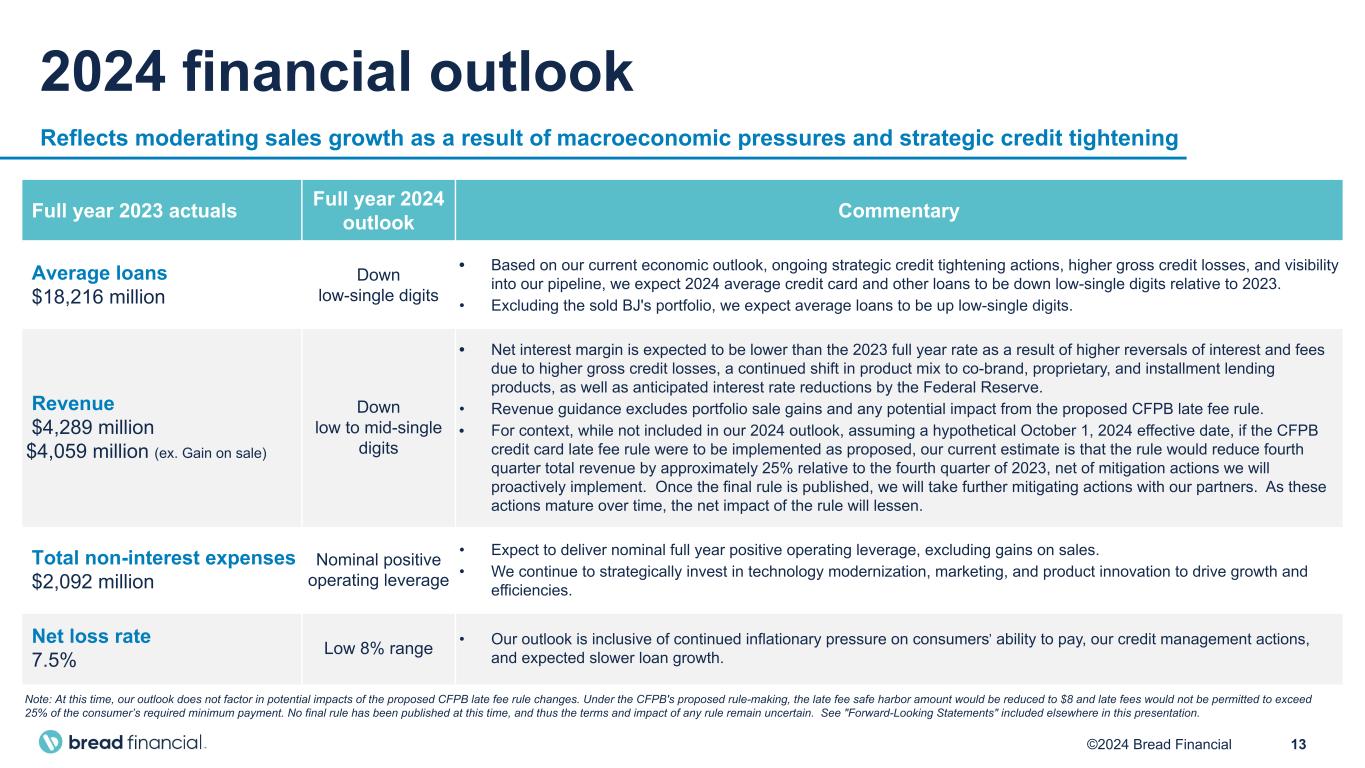 12©2024 Bread Financial Enhanced credit risk management and underlying credit distribution Strengthened balance sheet and funding mixStrong corporate governance Prudent balance sheet management Expense discipline Proactive risk management Active recession readiness playbook Enhanced core capabilities Strengthened financial resilience Bread Financial is positioned to perform well through a full economic cycle Loan loss reserve materially higher Capital ratios significantly improved Increased mix of direct-to-consumer deposits Reduced debt levels Diversification across products and partners Prudent and proactive line management Credit mix shift to higher quality over time Well-established risk appetite metrics