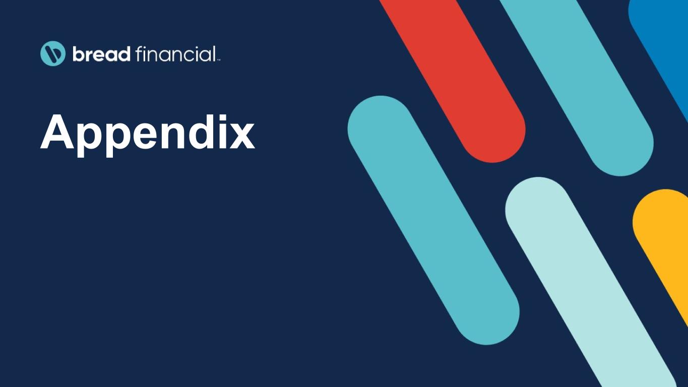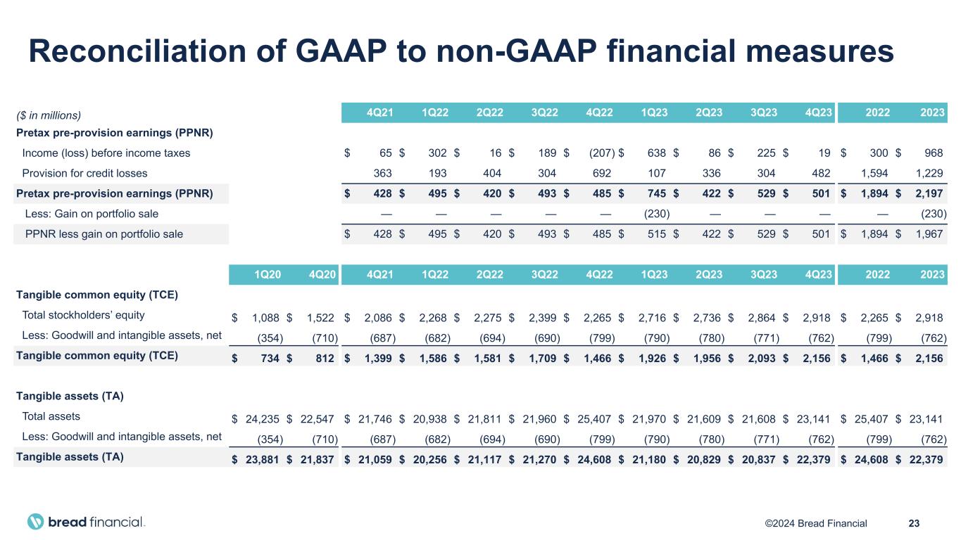 23©2024 Bread Financial ($ in millions) 4Q21 1Q22 2Q22 3Q22 4Q22 1Q23 2Q23 3Q23 4Q23 2022 2023 Pretax pre-provision earnings (PPNR) Income (loss) before income taxes $ 65 $ 302 $ 16 $ 189 $ (207) $ 638 $ 86 $ 225 $ 19 $ 300 $ 968 Provision for credit losses 363 193 404 304 692 107 336 304 482 1,594 1,229 Pretax pre-provision earnings (PPNR) $ 428 $ 495 $ 420 $ 493 $ 485 $ 745 $ 422 $ 529 $ 501 $ 1,894 $ 2,197 Less: Gain on portfolio sale — — — — — (230) — — — — (230) PPNR less gain on portfolio sale $ 428 $ 495 $ 420 $ 493 $ 485 $ 515 $ 422 $ 529 $ 501 $ 1,894 $ 1,967 1Q20 4Q20 4Q21 1Q22 2Q22 3Q22 4Q22 1Q23 2Q23 3Q23 4Q23 2022 2023 Tangible common equity (TCE) Total stockholders’ equity $ 1,088 $ 1,522 $ 2,086 $ 2,268 $ 2,275 $ 2,399 $ 2,265 $ 2,716 $ 2,736 $ 2,864 $ 2,918 $ 2,265 $ 2,918 Less: Goodwill and intangible assets, net (354) (710) (687) (682) (694) (690) (799) (790) (780) (771) (762) (799) (762) Tangible common equity (TCE) $ 734 $ 812 $ 1,399 $ 1,586 $ 1,581 $ 1,709 $ 1,466 $ 1,926 $ 1,956 $ 2,093 $ 2,156 $ 1,466 $ 2,156 Tangible assets (TA) Total assets $ 24,235 $ 22,547 $ 21,746 $ 20,938 $ 21,811 $ 21,960 $ 25,407 $ 21,970 $ 21,609 $ 21,608 $ 23,141 $ 25,407 $ 23,141 Less: Goodwill and intangible assets, net (354) (710) (687) (682) (694) (690) (799) (790) (780) (771) (762) (799) (762) Tangible assets (TA) $ 23,881 $ 21,837 $ 21,059 $ 20,256 $ 21,117 $ 21,270 $ 24,608 $ 21,180 $ 20,829 $ 20,837 $ 22,379 $ 24,608 $ 22,379 Reconciliation of GAAP to non-GAAP financial measures