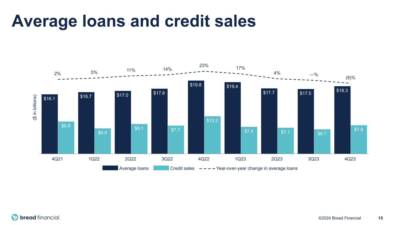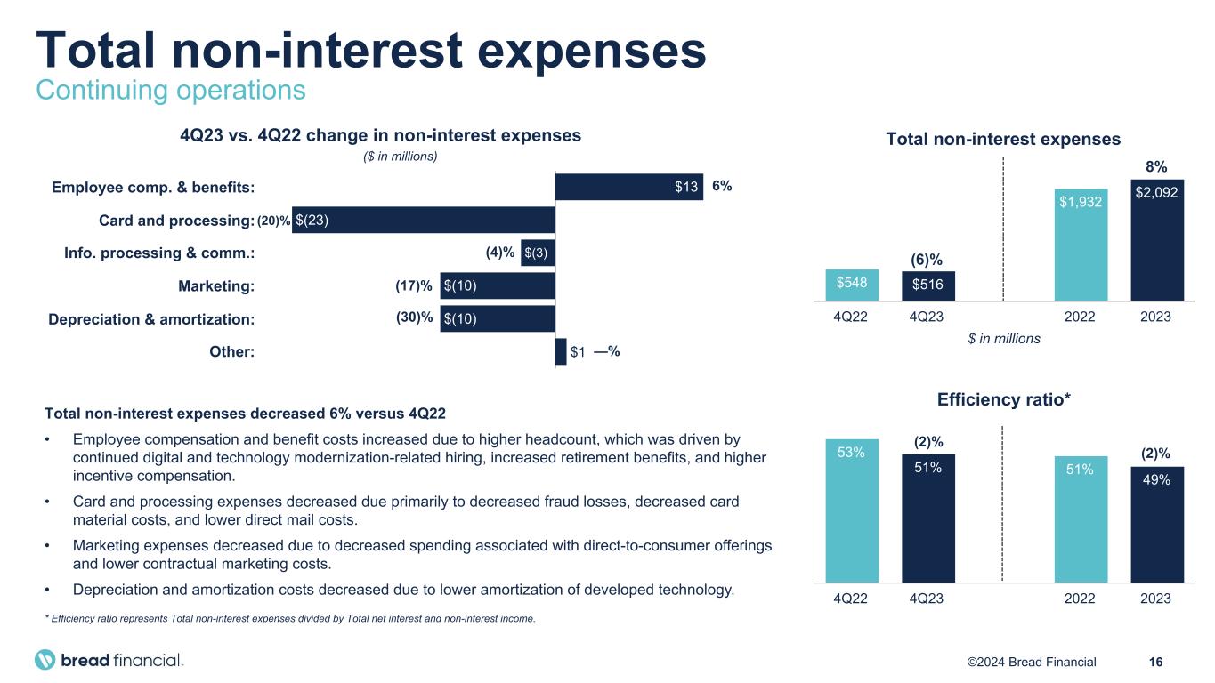 15©2024 Bread Financial ($ in b illi on s) $16.1 $16.7 $17.0 $17.6 $19.8 $19.4 $17.7 $17.5 $18.3 $8.8 $6.9 $8.1 $7.7 $10.2 $7.4 $7.1 $6.7 $7.8 2% 5% 11% 14% 23% 17% 4% —% (8)% Average loans Credit sales Year-over-year change in average loans 4Q21 1Q22 2Q22 3Q22 4Q22 1Q23 2Q23 3Q23 4Q23 Average loans and credit sales
