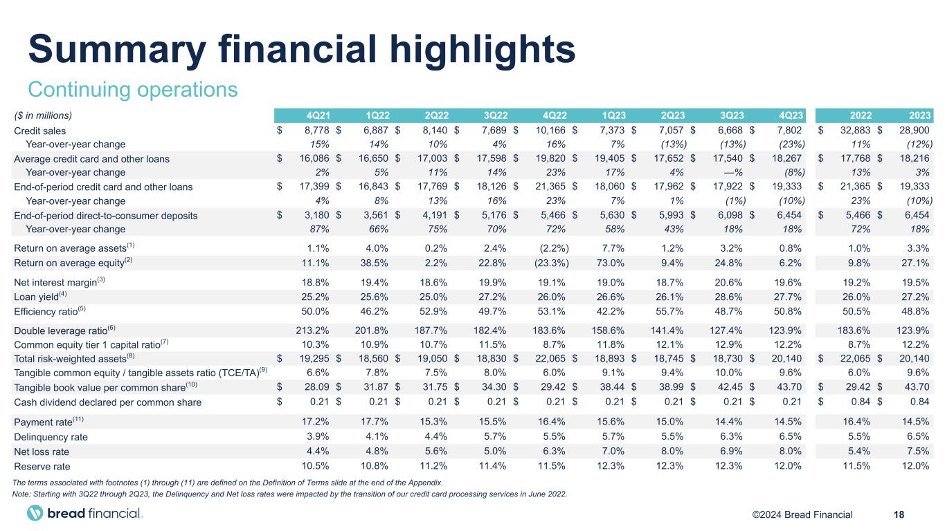 17©2024 Bread Financial ($ in millions) 4Q23 4Q22 4Q23 vs 4Q22 3Q23 4Q23 vs 3Q23 2023 2022 2023 vs 2022 Credit sales $ 7,802 $ 10,166 (23%) $ 6,668 17% $ 28,900 $ 32,883 (12%) Average credit card and other loans $ 18,267 $ 19,820 (8%) $ 17,540 4% $ 18,216 $ 17,768 3% End-of-period credit card and other loans $ 19,333 $ 21,365 (10%) $ 17,922 8% $ 19,333 $ 21,365 (10%) End-of-period direct-to-consumer deposits $ 6,454 $ 5,466 18% $ 6,098 6% $ 6,454 $ 5,466 18% Return on average assets(1) 0.8% (2.2%) 3.0% 3.2% (2.4%) 3.3% 1.0% 2.3% Return on average equity(2) 6.2% (23.3%) 29.5% 24.8% (18.6%) 27.1% 9.8% 17.3% Net interest margin(3) 19.6% 19.1% 0.5% 20.6% (1.0%) 19.5% 19.2% 0.3% Loan yield(4) 27.7% 26.0% 1.7% 28.6% (0.9%) 27.2% 26.0% 1.2% Efficiency ratio(5) 50.8% 53.1% (2.3%) 48.7% 2.1% 48.8% 50.5% (1.7%) Double leverage ratio(6) 123.9% 183.6% (59.7%) 127.4% (3.5%) 123.9% 183.6% (59.7%) Common equity tier 1 capital ratio(7) 12.2% 8.7% 3.5% 12.9% (0.7%) 12.2% 8.7% 3.5% Total risk-weighted assets(8) $ 20,140 $ 22,065 (9%) $ 18,730 8% $ 20,140 $ 22,065 (9%) Tangible common equity / tangible assets ratio (TCE/TA)(9) 9.6% 6.0% 3.6% 10.0% (0.4%) 9.6% 6.0% 3.6% Tangible book value per common share(10) $ 43.70 $ 29.42 49% $ 42.45 3% $ 43.70 $ 29.42 49% Cash dividend declared per common share $ 0.21 $ 0.21 —% $ 0.21 —% $ 0.84 $ 0.84 —% Payment rate(11) 14.5% 16.4% (1.9%) 14.4% 0.1% 14.5% 16.4% (1.9%) Delinquency rate 6.5% 5.5% 1.0% 6.3% 0.2% 6.5% 5.5% 1.0% Net loss rate 8.0% 6.3% 1.7% 6.9% 1.1% 7.5% 5.4% 2.1% Reserve rate 12.0% 11.5% 0.5% 12.3% (0.3%) 12.0% 11.5% 0.5% Summary financial highlights Continuing operations The terms associated with footnotes (1) through (11) are defined on the Definition of Terms slide at the end of the Appendix. Note: Starting with 3Q22 through 2Q23, the Delinquency and Net loss rates were impacted by the transition of our credit card processing services in June 2022.