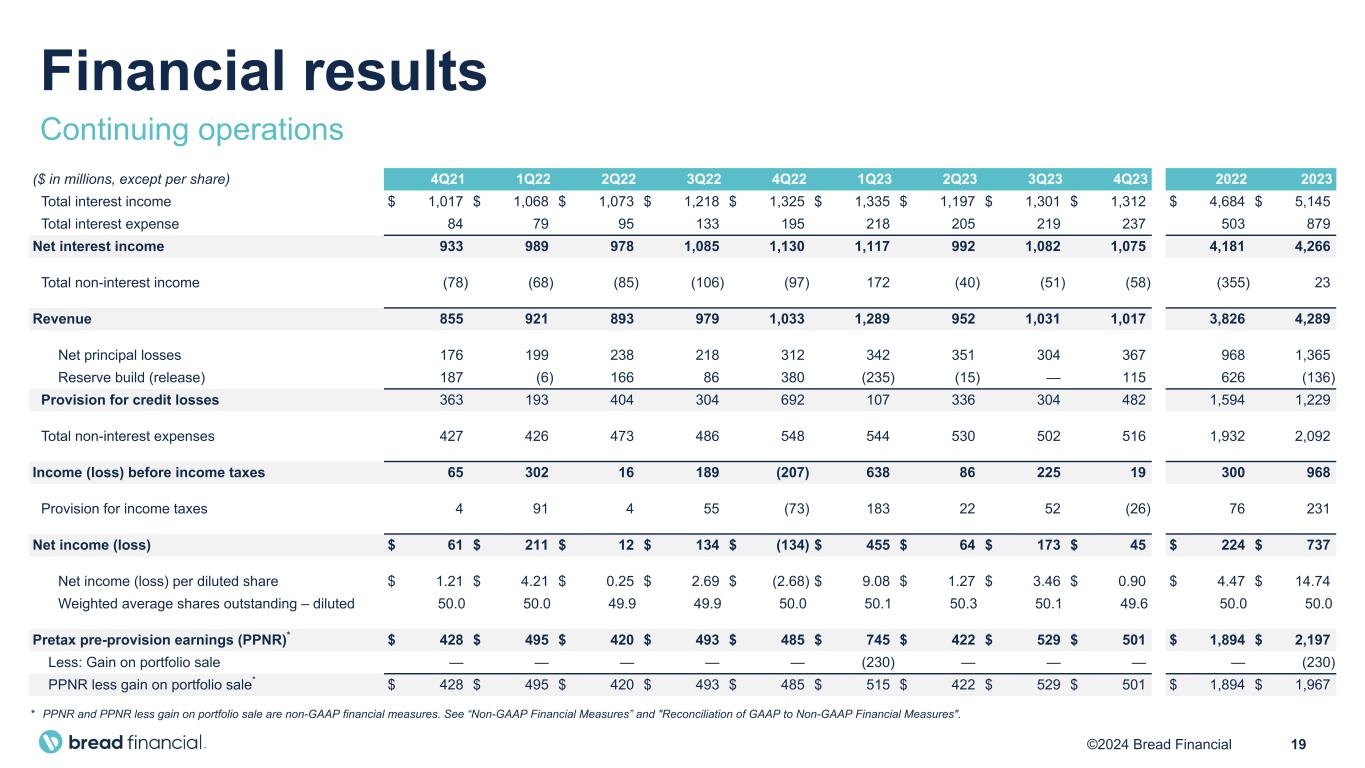 18©2024 Bread Financial ($ in millions) 4Q21 1Q22 2Q22 3Q22 4Q22 1Q23 2Q23 3Q23 4Q23 2022 2023 Credit sales $ 8,778 $ 6,887 $ 8,140 $ 7,689 $ 10,166 $ 7,373 $ 7,057 $ 6,668 $ 7,802 $ 32,883 $ 28,900 Year-over-year change 15% 14% 10% 4% 16% 7% (13%) (13%) (23%) 11% (12%) Average credit card and other loans $ 16,086 $ 16,650 $ 17,003 $ 17,598 $ 19,820 $ 19,405 $ 17,652 $ 17,540 $ 18,267 $ 17,768 $ 18,216 Year-over-year change 2% 5% 11% 14% 23% 17% 4% —% (8%) 13% 3% End-of-period credit card and other loans $ 17,399 $ 16,843 $ 17,769 $ 18,126 $ 21,365 $ 18,060 $ 17,962 $ 17,922 $ 19,333 $ 21,365 $ 19,333 Year-over-year change 4% 8% 13% 16% 23% 7% 1% (1%) (10%) 23% (10%) End-of-period direct-to-consumer deposits $ 3,180 $ 3,561 $ 4,191 $ 5,176 $ 5,466 $ 5,630 $ 5,993 $ 6,098 $ 6,454 $ 5,466 $ 6,454 Year-over-year change 87% 66% 75% 70% 72% 58% 43% 18% 18% 72% 18% Return on average assets(1) 1.1% 4.0% 0.2% 2.4% (2.2%) 7.7% 1.2% 3.2% 0.8% 1.0% 3.3% Return on average equity(2) 11.1% 38.5% 2.2% 22.8% (23.3%) 73.0% 9.4% 24.8% 6.2% 9.8% 27.1% Net interest margin(3) 18.8% 19.4% 18.6% 19.9% 19.1% 19.0% 18.7% 20.6% 19.6% 19.2% 19.5% Loan yield(4) 25.2% 25.6% 25.0% 27.2% 26.0% 26.6% 26.1% 28.6% 27.7% 26.0% 27.2% Efficiency ratio(5) 50.0% 46.2% 52.9% 49.7% 53.1% 42.2% 55.7% 48.7% 50.8% 50.5% 48.8% Double leverage ratio(6) 213.2% 201.8% 187.7% 182.4% 183.6% 158.6% 141.4% 127.4% 123.9% 183.6% 123.9% Common equity tier 1 capital ratio(7) 10.3% 10.9% 10.7% 11.5% 8.7% 11.8% 12.1% 12.9% 12.2% 8.7% 12.2% Total risk-weighted assets(8) $ 19,295 $ 18,560 $ 19,050 $ 18,830 $ 22,065 $ 18,893 $ 18,745 $ 18,730 $ 20,140 $ 22,065 $ 20,140 Tangible common equity / tangible assets ratio (TCE/TA)(9) 6.6% 7.8% 7.5% 8.0% 6.0% 9.1% 9.4% 10.0% 9.6% 6.0% 9.6% Tangible book value per common share(10) $ 28.09 $ 31.87 $ 31.75 $ 34.30 $ 29.42 $ 38.44 $ 38.99 $ 42.45 $ 43.70 $ 29.42 $ 43.70 Cash dividend declared per common share $ 0.21 $ 0.21 $ 0.21 $ 0.21 $ 0.21 $ 0.21 $ 0.21 $ 0.21 $ 0.21 $ 0.84 $ 0.84 Payment rate(11) 17.2% 17.7% 15.3% 15.5% 16.4% 15.6% 15.0% 14.4% 14.5% 16.4% 14.5% Delinquency rate 3.9% 4.1% 4.4% 5.7% 5.5% 5.7% 5.5% 6.3% 6.5% 5.5% 6.5% Net loss rate 4.4% 4.8% 5.6% 5.0% 6.3% 7.0% 8.0% 6.9% 8.0% 5.4% 7.5% Reserve rate 10.5% 10.8% 11.2% 11.4% 11.5% 12.3% 12.3% 12.3% 12.0% 11.5% 12.0% Summary financial highlights Continuing operations The terms associated with footnotes (1) through (11) are defined on the Definition of Terms slide at the end of the Appendix. Note: Starting with 3Q22 through 2Q23, the Delinquency and Net loss rates were impacted by the transition of our credit card processing services in June 2022.