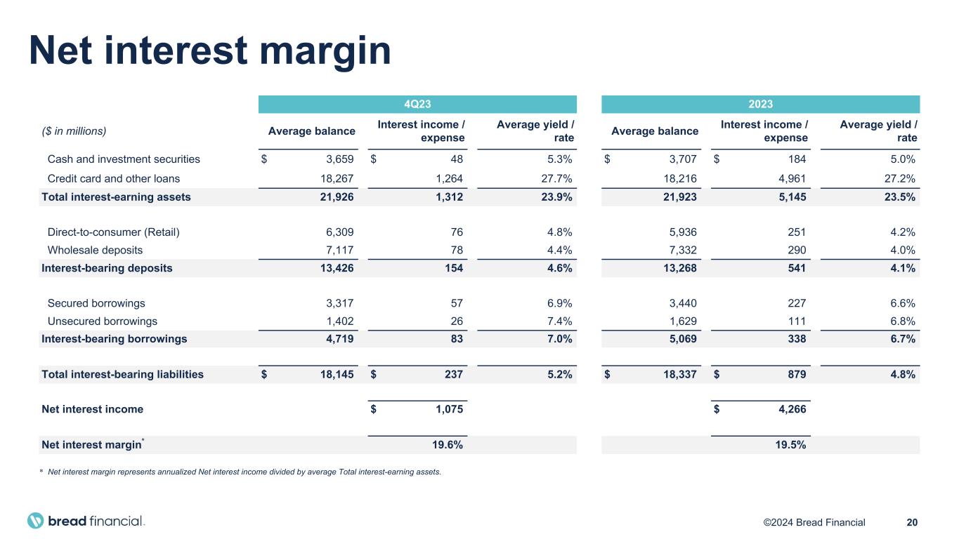 19©2024 Bread Financial ($ in millions, except per share) 4Q21 1Q22 2Q22 3Q22 4Q22 1Q23 2Q23 3Q23 4Q23 2022 2023 Total interest income $ 1,017 $ 1,068 $ 1,073 $ 1,218 $ 1,325 $ 1,335 $ 1,197 $ 1,301 $ 1,312 $ 4,684 $ 5,145 Total interest expense 84 79 95 133 195 218 205 219 237 503 879 Net interest income 933 989 978 1,085 1,130 1,117 992 1,082 1,075 4,181 4,266 Total non-interest income (78) (68) (85) (106) (97) 172 (40) (51) (58) (355) 23 Revenue 855 921 893 979 1,033 1,289 952 1,031 1,017 3,826 4,289 Net principal losses 176 199 238 218 312 342 351 304 367 968 1,365 Reserve build (release) 187 (6) 166 86 380 (235) (15) — 115 626 (136) Provision for credit losses 363 193 404 304 692 107 336 304 482 1,594 1,229 Total non-interest expenses 427 426 473 486 548 544 530 502 516 1,932 2,092 Income (loss) before income taxes 65 302 16 189 (207) 638 86 225 19 300 968 Provision for income taxes 4 91 4 55 (73) 183 22 52 (26) 76 231 Net income (loss) $ 61 $ 211 $ 12 $ 134 $ (134) $ 455 $ 64 $ 173 $ 45 $ 224 $ 737 Net income (loss) per diluted share $ 1.21 $ 4.21 $ 0.25 $ 2.69 $ (2.68) $ 9.08 $ 1.27 $ 3.46 $ 0.90 $ 4.47 $ 14.74 Weighted average shares outstanding – diluted 50.0 50.0 49.9 49.9 50.0 50.1 50.3 50.1 49.6 50.0 50.0 Pretax pre-provision earnings (PPNR)* $ 428 $ 495 $ 420 $ 493 $ 485 $ 745 $ 422 $ 529 $ 501 $ 1,894 $ 2,197 Less: Gain on portfolio sale — — — — — (230) — — — — (230) PPNR less gain on portfolio sale* $ 428 $ 495 $ 420 $ 493 $ 485 $ 515 $ 422 $ 529 $ 501 $ 1,894 $ 1,967 * PPNR and PPNR less gain on portfolio sale are non-GAAP financial measures. See “Non-GAAP Financial Measures” and "Reconciliation of GAAP to Non-GAAP Financial Measures". Financial results Continuing operations