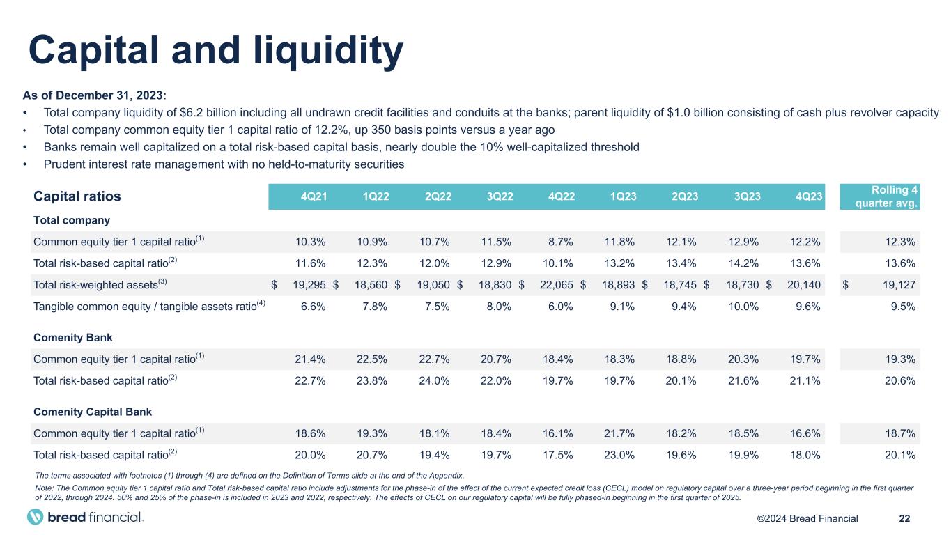 22©2024 Bread Financial Capital ratios 4Q21 1Q22 2Q22 3Q22 4Q22 1Q23 2Q23 3Q23 4Q23 Rolling 4 quarter avg. Total company Common equity tier 1 capital ratio(1) 10.3% 10.9% 10.7% 11.5% 8.7% 11.8% 12.1% 12.9% 12.2% 12.3% Total risk-based capital ratio(2) 11.6% 12.3% 12.0% 12.9% 10.1% 13.2% 13.4% 14.2% 13.6% 13.6% Total risk-weighted assets(3) $ 19,295 $ 18,560 $ 19,050 $ 18,830 $ 22,065 $ 18,893 $ 18,745 $ 18,730 $ 20,140 $ 19,127 Tangible common equity / tangible assets ratio(4) 6.6% 7.8% 7.5% 8.0% 6.0% 9.1% 9.4% 10.0% 9.6% 9.5% Comenity Bank Common equity tier 1 capital ratio(1) 21.4% 22.5% 22.7% 20.7% 18.4% 18.3% 18.8% 20.3% 19.7% 19.3% Total risk-based capital ratio(2) 22.7% 23.8% 24.0% 22.0% 19.7% 19.7% 20.1% 21.6% 21.1% 20.6% Comenity Capital Bank Common equity tier 1 capital ratio(1) 18.6% 19.3% 18.1% 18.4% 16.1% 21.7% 18.2% 18.5% 16.6% 18.7% Total risk-based capital ratio(2) 20.0% 20.7% 19.4% 19.7% 17.5% 23.0% 19.6% 19.9% 18.0% 20.1% As of December 31, 2023: • Total company liquidity of $6.2 billion including all undrawn credit facilities and conduits at the banks; parent liquidity of $1.0 billion consisting of cash plus revolver capacity • Total company common equity tier 1 capital ratio of 12.2%, up 350 basis points versus a year ago • Banks remain well capitalized on a total risk-based capital basis, nearly double the 10% well-capitalized threshold • Prudent interest rate management with no held-to-maturity securities Capital and liquidity The terms associated with footnotes (1) through (4) are defined on the Definition of Terms slide at the end of the Appendix. Note: The Common equity tier 1 capital ratio and Total risk-based capital ratio include adjustments for the phase-in of the effect of the current expected credit loss (CECL) model on regulatory capital over a three-year period beginning in the first quarter of 2022, through 2024. 50% and 25% of the phase-in is included in 2023 and 2022, respectively. The effects of CECL on our regulatory capital will be fully phased-in beginning in the first quarter of 2025.