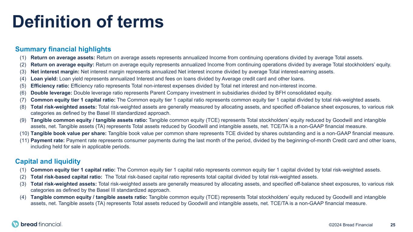 25©2024 Bread Financial Definition of terms Summary financial highlights (1) Return on average assets: Return on average assets represents annualized Income from continuing operations divided by average Total assets. (2) Return on average equity: Return on average equity represents annualized Income from continuing operations divided by average Total stockholders’ equity. (3) Net interest margin: Net interest margin represents annualized Net interest income divided by average Total interest-earning assets. (4) Loan yield: Loan yield represents annualized Interest and fees on loans divided by Average credit card and other loans. (5) Efficiency ratio: Efficiency ratio represents Total non-interest expenses divided by Total net interest and non-interest income. (6) Double leverage: Double leverage ratio represents Parent Company investment in subsidiaries divided by BFH consolidated equity. (7) Common equity tier 1 capital ratio: The Common equity tier 1 capital ratio represents common equity tier 1 capital divided by total risk-weighted assets. (8) Total risk-weighted assets: Total risk-weighted assets are generally measured by allocating assets, and specified off-balance sheet exposures, to various risk categories as defined by the Basel III standardized approach. (9) Tangible common equity / tangible assets ratio: Tangible common equity (TCE) represents Total stockholders’ equity reduced by Goodwill and intangible assets, net. Tangible assets (TA) represents Total assets reduced by Goodwill and intangible assets, net. TCE/TA is a non-GAAP financial measure. (10) Tangible book value per share: Tangible book value per common share represents TCE divided by shares outstanding and is a non-GAAP financial measure. (11) Payment rate: Payment rate represents consumer payments during the last month of the period, divided by the beginning-of-month Credit card and other loans, including held for sale in applicable periods. Capital and liquidity (1) Common equity tier 1 capital ratio: The Common equity tier 1 capital ratio represents common equity tier 1 capital divided by total risk-weighted assets. (2) Total risk-based capital ratio: The Total risk-based capital ratio represents total capital divided by total risk-weighted assets. (3) Total risk-weighted assets: Total risk-weighted assets are generally measured by allocating assets, and specified off-balance sheet exposures, to various risk categories as defined by the Basel III standardized approach. (4) Tangible common equity / tangible assets ratio: Tangible common equity (TCE) represents Total stockholders’ equity reduced by Goodwill and intangible assets, net. Tangible assets (TA) represents Total assets reduced by Goodwill and intangible assets, net. TCE/TA is a non-GAAP financial measure.