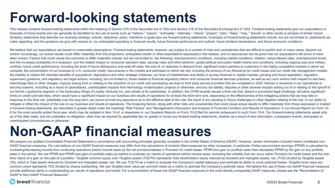 2©2024 Bread Financial Forward-looking statements This release contains forward-looking statements within the meaning of Section 27A of the Securities Act of 1933 and Section 21E of the Securities Exchange Act of 1934. Forward-looking statements give our expectations or forecasts of future events and can generally be identified by the use of words such as “believe,” “expect,” “anticipate,” “estimate,” “intend,” “project,” “plan,” “likely,” “may,” “should” or other words or phrases of similar import. Similarly, statements that describe our business strategy, outlook, objectives, plans, intentions or goals also are forward-looking statements. Examples of forward-looking statements include, but are not limited to, statements we make regarding, and the guidance we give with respect to, our anticipated operating or financial results, future financial performance and outlook, future dividend declarations, and future economic conditions. We believe that our expectations are based on reasonable assumptions. Forward-looking statements, however, are subject to a number of risks and uncertainties that are difficult to predict and, in many cases, beyond our control. Accordingly, our actual results could differ materially from the projections, anticipated results or other expectations expressed in this release, and no assurances can be given that our expectations will prove to have been correct. Factors that could cause the outcomes to differ materially include, but are not limited to, the following: macroeconomic conditions, including market conditions, inflation, rising interest rates, unemployment levels and the increased probability of a recession, and the related impact on consumer payment rates, savings rates and other behavior; global political and public health events and conditions, including ongoing wars and military conflicts; future credit performance, including the level of future delinquency and write-off rates; the loss of, or reduction in demand from, significant brand partners or customers in the highly competitive markets in which we compete; the concentration of our business in U.S. consumer credit; inaccuracies in the models and estimates on which we rely, including the amount of our Allowance for credit losses and our credit risk management models; the inability to realize the intended benefits of acquisitions, dispositions and other strategic initiatives; our level of indebtedness and ability to access financial or capital markets; pending and future legislation, regulation, supervisory guidance, and regulatory and legal actions, including, but not limited to, those related to financial regulatory reform and consumer financial services practices, as well as any such actions with respect to late fees, interchange fees or other charges; impacts arising from or relating to the transition of our credit card processing services to third party service providers that we completed in 2022; failures or breaches in our operational or security systems, including as a result of cyberattacks, unanticipated impacts from technology modernization projects or otherwise; and any tax liability, disputes or other adverse impacts arising out of or relating to the spinoff of our former LoyaltyOne segment or the bankruptcy filings of Loyalty Ventures Inc. and certain of its subsidiaries. In addition, the CFPB recently issued a final rule that, absent a successful legal challenge, will place significant limits on credit card late fees, which would have a significant impact on our business and results of operations for at least the short term and, depending on the effectiveness of the mitigating actions that we may take in response to the final rule, potentially over the long term; we cannot provide any assurance as to the effective date of the rule, the result of any pending or future challenges or other litigation relating to the rule, or our ability to mitigate or offset the impact of the rule on our business and results of operations. The foregoing factors, along with other risks and uncertainties that could cause actual results to differ materially from those expressed or implied in forward-looking statements, are described in greater detail under the headings “Risk Factors” and “Management’s Discussion and Analysis of Financial Condition and Results of Operations” in our Annual Report on Form 10- K for the most recently ended fiscal year, which may be updated in Item 1A of, or elsewhere in, our Quarterly Reports on Form 10-Q filed for periods subsequent to such Form 10-K. Our forward-looking statements speak only as of the date made, and we undertake no obligation, other than as required by applicable law, to update or revise any forward-looking statements, whether as a result of new information, subsequent events, anticipated or unanticipated circumstances or otherwise. Non-GAAP financial measures We prepare our audited Consolidated Financial Statements in accordance with accounting principles generally accepted in the United States of America (GAAP). However, certain information included herein constitutes non- GAAP financial measures. Our calculations of non-GAAP financial measures may differ from the calculations of similarly titled measures by other companies. In particular, Pretax pre-provision earnings (PPNR) is calculated by increasing/decreasing Income from continuing operations before income taxes by the net provision/release in Provision for credit losses. PPNR less gain on portfolio sales then decreases PPNR by the gain on any portfolio sales in the period. We use PPNR and PPNR less gain on portfolio sales as metrics to evaluate our results of operations before income taxes, excluding the volatility that can occur within Provision for credit losses and the one- time nature of a gain on the sale of a portfolio. Tangible common equity over Tangible assets (TCE/TA) represents Total stockholders’ equity reduced by Goodwill and intangible