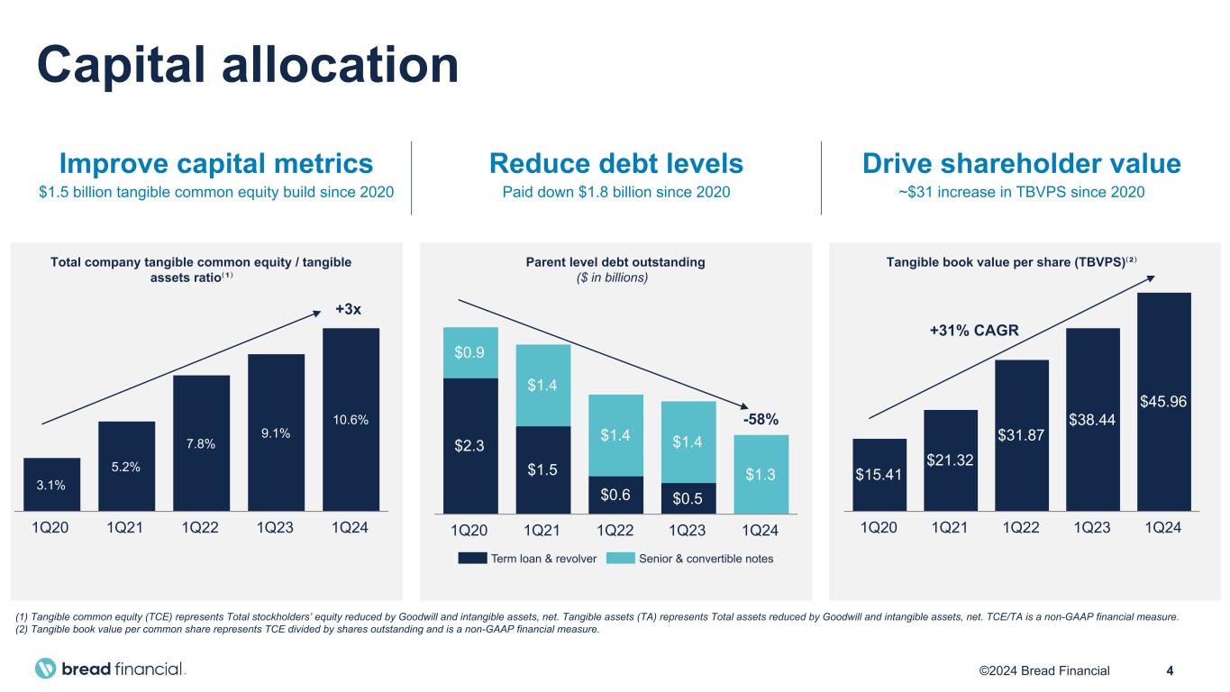 3©2024 Bread Financial Demonstrated financial resilience • Net income of $134 million and Earnings per diluted share of $2.70 • Tangible book value per share of $45.96 increased 20% year-over-year • Shares repurchased totaled $11 million, representing 293,000 shares at an average price per share of $37.54 • Direct-to-consumer deposits increased 24% versus the first quarter of 2023 to approximately $7 billion • Given strong investor demand, upsized senior unsecured notes offering to $900 million in January 2024 Proactive risk management • Meaningful progress made in implementing mitigation plans to limit the financial impact of the CFPB late fee rule ◦ Actions taken have improved previously estimated 4Q24 revenue impact • Consumer spending continues to moderate as consumers self-regulate and macroeconomic pressures persist ◦ Ongoing strategic credit tightening to balance macroeconomic headwinds and returns First quarter 2024 highlights