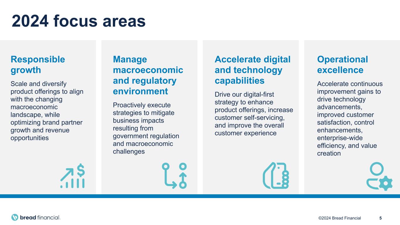 4©2024 Bread Financial Parent level debt outstanding $2.3 $1.5 $0.6 $0.5 $0.9 $1.4 $1.4 $1.4 $1.3 Term loan & revolver Senior & convertible notes 1Q20 1Q21 1Q22 1Q23 1Q24 (1) Tangible common equity (TCE) represents Total stockholders’ equity reduced by Goodwill and intangible assets, net. Tangible assets (TA) represents Total assets reduced by Goodwill and intangible assets, net. TCE/TA is a non-GAAP financial measure. (2) Tangible book value per common share represents TCE divided by shares outstanding and is a non-GAAP financial measure. Capital allocation Tangible book value per share (TBVPS)⁽²⁾ $15.41 $21.32 $31.87 $38.44 $45.96 1Q20 1Q21 1Q22 1Q23 1Q24 Total company tangible common equity / tangible assets ratio⁽¹⁾ 3.1% 5.2% 7.8% 9.1% 10.6% 1Q20 1Q21 1Q22 1Q23 1Q24 +3x +31% CAGR Drive shareholder valueImprove capital metrics -58% Reduce debt levels $1.5 billion tangible common equity build since 2020 ~$31 increase in TBVPS since 2020Paid down $1.8 billion since 2020 ($ in billions)