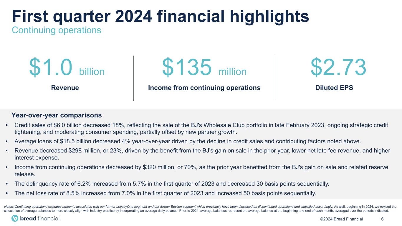 5©2024 Bread Financial 2024 focus areas Responsible growth Scale and diversify product offerings to align with the changing macroeconomic landscape, while optimizing brand partner growth and revenue opportunities Manage macroeconomic and regulatory environment Proactively execute strategies to mitigate business impacts resulting from government regulation and macroeconomic challenges Operational excellence Accelerate continuous improvement gains to drive technology advancements, improved customer satisfaction, control enhancements, enterprise-wide efficiency, and value creation Accelerate digital and technology capabilities Drive our digital-first strategy to enhance product offerings, increase customer self-servicing, and improve the overall customer experience