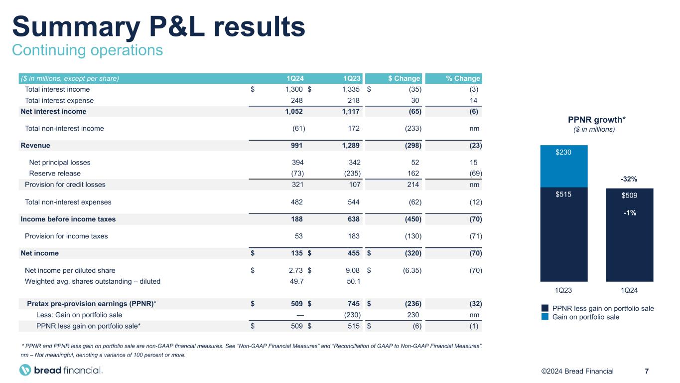 6©2024 Bread Financial First quarter 2024 financial highlights Continuing operations $1.0 billion Revenue $135 million Income from continuing operations $2.73 Diluted EPS Year-over-year comparisons • Credit sales of $6.0 billion decreased 18%, reflecting the sale of the BJ's Wholesale Club portfolio in late February 2023, ongoing strategic credit tightening, and moderating consumer spending, partially offset by new partner growth. • Average loans of $18.5 billion decreased 4% year-over-year driven by the decline in credit sales and contributing factors noted above. • Revenue decreased $298 million, or 23%, driven by the benefit from the BJ's gain on sale in the prior year, lower net late fee revenue, and higher interest expense. • Income from continuing operations decreased by $320 million, or 70%, as the prior year benefited from the BJ's gain on sale and related reserve release. • The delinquency rate of 6.2% increased from 5.7% in the first quarter of 2023 and decreased 30 basis points sequentially. • The net loss rate of 8.5% increased from 7.0% in the first quarter of 2023 and increased 50 basis points sequentially. Notes: Continuing operations excludes amounts associated with our former LoyaltyOne segment and our former Epsilon segment which previously have been disclosed as discontinued operations and classified accordingly. As well, beginning in 2024, we revised the calculation of average balances to more closely align with industry practice by incorporating an average daily balance. Prior to 2024, average balances represent the average balance at the beginning and end of each month, averaged over the periods indicated.