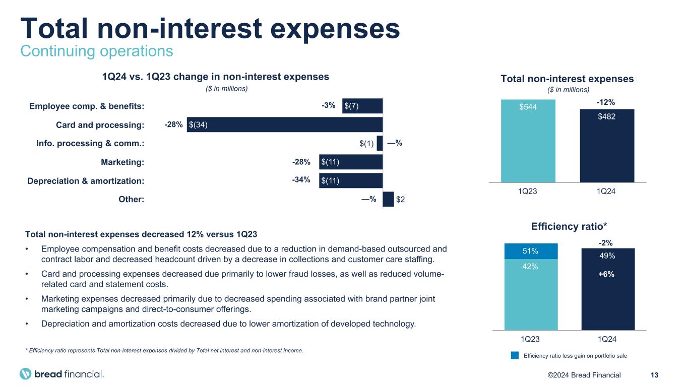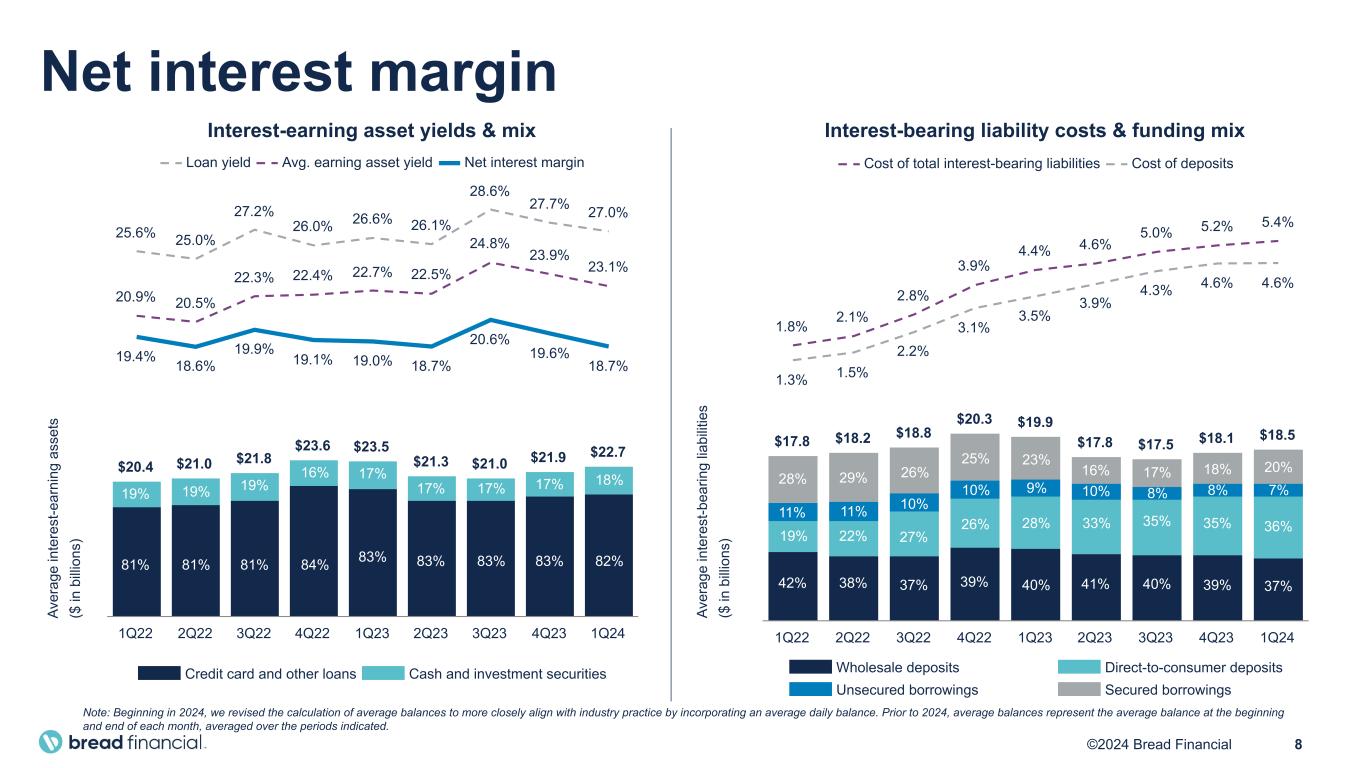 7©2024 Bread Financial ($ in millions, except per share) 1Q24 1Q23 $ Change % Change Total interest income $ 1,300 $ 1,335 $ (35) (3) Total interest expense 248 218 30 14 Net interest income 1,052 1,117 (65) (6) Total non-interest income (61) 172 (233) nm Revenue 991 1,289 (298) (23) Net principal losses 394 342 52 15 Reserve release (73) (235) 162 (69) Provision for credit losses 321 107 214 nm Total non-interest expenses 482 544 (62) (12) Income before income taxes 188 638 (450) (70) Provision for income taxes 53 183 (130) (71) Net income $ 135 $ 455 $ (320) (70) Net income per diluted share $ 2.73 $ 9.08 $ (6.35) (70) Weighted avg. shares outstanding – diluted 49.7 50.1 Pretax pre-provision earnings (PPNR)* $ 509 $ 745 $ (236) (32) Less: Gain on portfolio sale — (230) 230 nm PPNR less gain on portfolio sale* $ 509 $ 515 $ (6) (1) PPNR growth* $515 $509 $230 PPNR less gain on portfolio sale Gain on portfolio sale 1Q23 1Q24 * PPNR and PPNR less gain on portfolio sale are non-GAAP financial measures. See “Non-GAAP Financial Measures” and "Reconciliation of GAAP to Non-GAAP Financial Measures". nm – Not meaningful, denoting a variance of 100 percent or more. Summary P&L results Continuing operations -1% -32% ($ in millions)