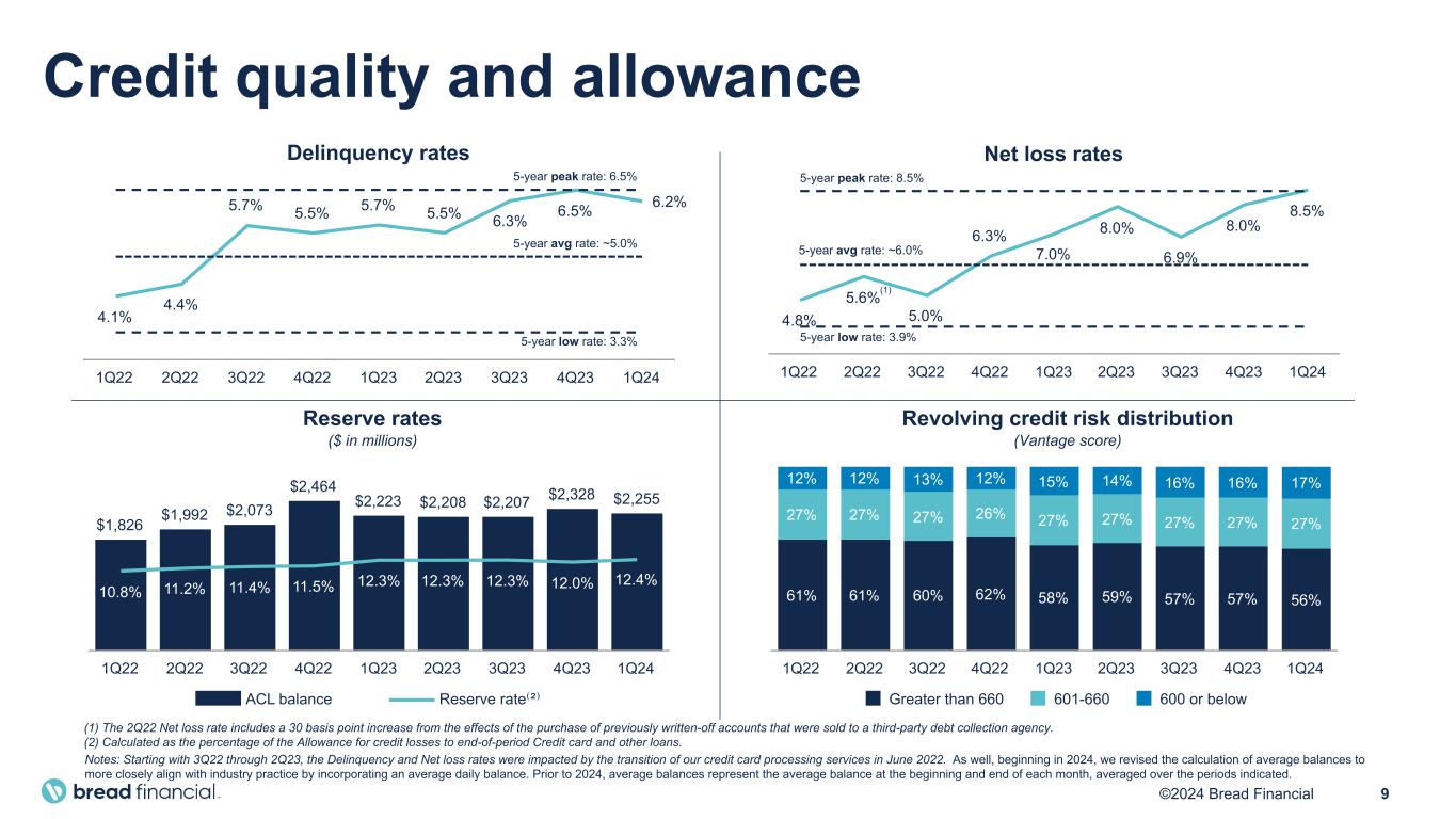8©2024 Bread Financial $17.8 $18.2 $18.8 $20.3 $19.9 $17.8 $17.5 $18.1 $18.5 Wholesale deposits Direct-to-consumer deposits Unsecured borrowings Secured borrowings 1Q22 2Q22 3Q22 4Q22 1Q23 2Q23 3Q23 4Q23 1Q24 $20.4 $21.0 $21.8 $23.6 $23.5 $21.3 $21.0 $21.9 $22.7 Credit card and other loans Cash and investment securities 1Q22 2Q22 3Q22 4Q22 1Q23 2Q23 3Q23 4Q23 1Q24 Av er ag e in te re st -b ea rin g lia bi lit ie s ($ in b ill io ns ) Av er ag e in te re st -e ar ni ng a ss et s ($ in b ill io ns ) Interest-earning asset yields & mix 25.6% 25.0% 27.2% 26.0% 26.6% 26.1% 28.6% 27.7% 27.0% 20.9% 20.5% 22.3% 22.4% 22.7% 22.5% 24.8% 23.9% 23.1% 19.4% 18.6% 19.9% 19.1% 19.0% 18.7% 20.6% 19.6% 18.7% Loan yield Avg. earning asset yield Net interest margin Interest-bearing liability costs & funding mix 1.8% 2.1% 2.8% 3.9% 4.4% 4.6% 5.0% 5.2% 5.4% 1.3% 1.5% 2.2% 3.1% 3.5% 3.9% 4.3% 4.6% 4.6% Cost of total interest-bearing liabilities Cost of deposits Net interest margin 81% 81% 81% 84% 83% 83% 83% 83% 82% 19% 19% 19% 16% 17% 17% 17% 17% 18% 28% 29% 26% 25% 23% 16% 17% 18% 20% 11% 11% 10% 10% 9% 10% 8% 8% 7% 19% 22% 27% 26% 28% 33% 35% 35% 36% 42% 38% 37% 39% 40% 41% 40% 39% 37% Note: Beginning in 2024, we revised the calculation of average balances to more closely align with industry practice by incorporating an average daily balance. Prior to 2024, average balances represent the average balance at the beginning and end of each month, averaged over the periods indicated.