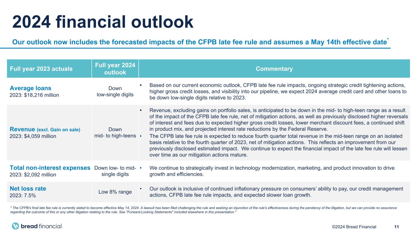 11©2024 Bread Financial 2024 financial outlook Our outlook now includes the forecasted impacts of the CFPB late fee rule and assumes a May 14th effective date* * The CFPB's final late fee rule is currently slated to become effective May 14, 2024. A lawsuit has been filed challenging the rule and seeking an injunction of the rule's effectiveness during the pendency of the litigation, but we can provide no assurance regarding the outcome of this or any other litigation relating to the rule. See "Forward-Looking Statements" included elsewhere in this presentation." Full year 2023 actuals Full year 2024 outlook Commentary Average loans 2023: $18,216 million Down low-single digits • Based on our current economic outlook, CFPB late fee rule impacts, ongoing strategic credit tightening actions, higher gross credit losses, and visibility into our pipeline, we expect 2024 average credit card and other loans to be down low-single digits relative to 2023. Revenue (excl. Gain on sale) 2023: $4,059 million Down mid- to high-teens • Revenue, excluding gains on portfolio sales, is anticipated to be down in the mid- to high-teen range as a result of the impact of the CFPB late fee rule, net of mitigation actions, as well as previously disclosed higher reversals of interest and fees due to expected higher gross credit losses, lower merchant discount fees, a continued shift in product mix, and projected interest rate reductions by the Federal Reserve. • The CFPB late fee rule is expected to reduce fourth quarter total revenue in the mid-teen range on an isolated basis relative to the fourth quarter of 2023, net of mitigation actions. This reflects an improvement from our previously disclosed estimated impact. We continue to expect the financial impact of the late fee rule will lessen over time as our mitigation actions mature. Total non-interest expenses 2023: $2,092 million Down low- to mid- single digits • We continue to strategically invest in technology modernization, marketing, and product innovation to drive growth and efficiencies. Net loss rate 2023: 7.5% Low 8% range • Our outlook is inclusive of continued inflationary pressure on consumers’ ability to pay, our credit management actions, CFPB late fee rule impacts, and expected slower loan growth.