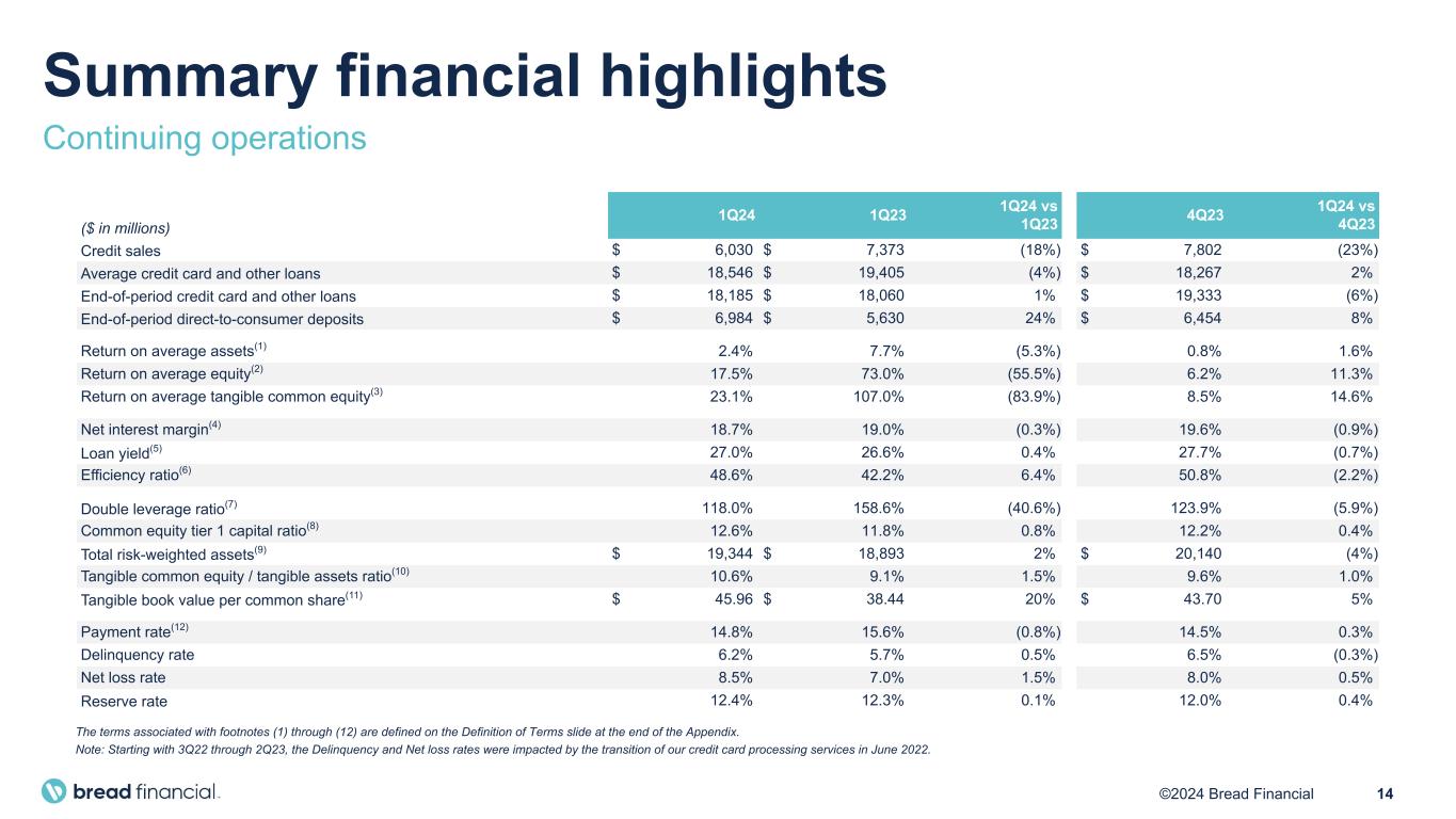 13©2024 Bread Financial Total non-interest expenses decreased 12% versus 1Q23 • Employee compensation and benefit costs decreased due to a reduction in demand-based outsourced and contract labor and decreased headcount driven by a decrease in collections and customer care staffing. • Card and processing expenses decreased due primarily to lower fraud losses, as well as reduced volume- related card and statement costs. • Marketing expenses decreased primarily due to decreased spending associated with brand partner joint marketing campaigns and direct-to-consumer offerings. • Depreciation and amortization costs decreased due to lower amortization of developed technology. Efficiency ratio* 42% 49% 1Q23 1Q24 Total non-interest expenses $544 $482 1Q23 1Q24 Total non-interest expenses Continuing operations $(7) $(34) $(1) $(11) $(11) $2 Employee comp. & benefits: Card and processing: Info. processing & comm.: Marketing: Depreciation & amortization: Other: -3% -28% —% -28% -34% —% 1Q24 vs. 1Q23 change in non-interest expenses * Efficiency ratio represents Total non-interest expenses divided by Total net interest and non-interest income. ($ in millions) -12% +6% 51% -2% Efficiency ratio less gain on portfolio sale ($ in millions)