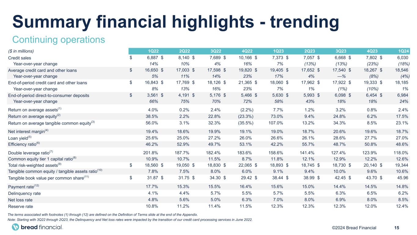 14©2024 Bread Financial ($ in millions) 1Q24 1Q23 1Q24 vs 1Q23 4Q23 1Q24 vs 4Q23 Credit sales $ 6,030 $ 7,373 (18%) $ 7,802 (23%) Average credit card and other loans $ 18,546 $ 19,405 (4%) $ 18,267 2% End-of-period credit card and other loans $ 18,185 $ 18,060 1% $ 19,333 (6%) End-of-period direct-to-consumer deposits $ 6,984 $ 5,630 24% $ 6,454 8% Return on average assets(1) 2.4% 7.7% (5.3%) 0.8% 1.6% Return on average equity(2) 17.5% 73.0% (55.5%) 6.2% 11.3% Return on average tangible common equity(3) 23.1% 107.0% (83.9%) 8.5% 14.6% Net interest margin(4) 18.7% 19.0% (0.3%) 19.6% (0.9%) Loan yield(5) 27.0% 26.6% 0.4% 27.7% (0.7%) Efficiency ratio(6) 48.6% 42.2% 6.4% 50.8% (2.2%) Double leverage ratio(7) 118.0% 158.6% (40.6%) 123.9% (5.9%) Common equity tier 1 capital ratio(8) 12.6% 11.8% 0.8% 12.2% 0.4% Total risk-weighted assets(9) $ 19,344 $ 18,893 2% $ 20,140 (4%) Tangible common equity / tangible assets ratio(10) 10.6% 9.1% 1.5% 9.6% 1.0% Tangible book value per common share(11) $ 45.96 $ 38.44 20% $ 43.70 5% Payment rate(12) 14.8% 15.6% (0.8%) 14.5% 0.3% Delinquency rate 6.2% 5.7% 0.5% 6.5% (0.3%) Net loss rate 8.5% 7.0% 1.5% 8.0% 0.5% Reserve rate 12.4% 12.3% 0.1% 12.0% 0.4% Summary financial highlights Continuing operations The terms associated with footnotes (1) through (12) are defined on the Definition of Terms slide at the end of the Appendix. Note: Starting with 3Q22 through 2Q23, the Delinquency and Net loss rates were impacted by the transition of our credit card processing services in June 2022.