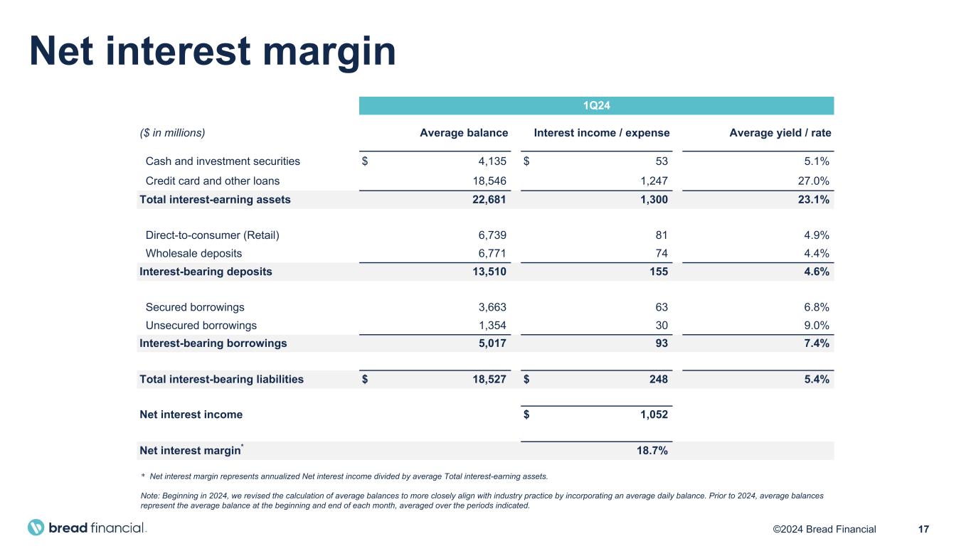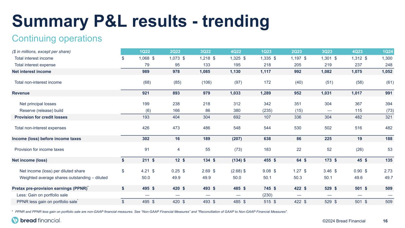 16©2024 Bread Financial ($ in millions, except per share) 1Q22 2Q22 3Q22 4Q22 1Q23 2Q23 3Q23 4Q23 1Q24 Total interest income $ 1,068 $ 1,073 $ 1,218 $ 1,325 $ 1,335 $ 1,197 $ 1,301 $ 1,312 $ 1,300 Total interest expense 79 95 133 195 218 205 219 237 248 Net interest income 989 978 1,085 1,130 1,117 992 1,082 1,075 1,052 Total non-interest income (68) (85) (106) (97) 172 (40) (51) (58) (61) Revenue 921 893 979 1,033 1,289 952 1,031 1,017 991 Net principal losses 199 238 218 312 342 351 304 367 394 Reserve (release) build (6) 166 86 380 (235) (15) — 115 (73) Provision for credit losses 193 404 304 692 107 336 304 482 321 Total non-interest expenses 426 473 486 548 544 530 502 516 482 Income (loss) before income taxes 302 16 189 (207) 638 86 225 19 188 Provision for income taxes 91 4 55 (73) 183 22 52 (26) 53 Net income (loss) $ 211 $ 12 $ 134 $ (134) $ 455 $ 64 $ 173 $ 45 $ 135 Net income (loss) per diluted share $ 4.21 $ 0.25 $ 2.69 $ (2.68) $ 9.08 $ 1.27 $ 3.46 $ 0.90 $ 2.73 Weighted average shares outstanding – diluted 50.0 49.9 49.9 50.0 50.1 50.3 50.1 49.6 49.7 Pretax pre-provision earnings (PPNR)* $ 495 $ 420 $ 493 $ 485 $ 745 $ 422 $ 529 $ 501 $ 509 Less: Gain on portfolio sale — — — — (230) — — — — PPNR less gain on portfolio sale* $ 495 $ 420 $ 493 $ 485 $ 515 $ 422 $ 529 $ 501 $ 509 * PPNR and PPNR less gain on portfolio sale are non-GAAP financial measures. See “Non-GAAP Financial Measures” and "Reconciliation of GAAP to Non-GAAP Financial Measures". Summary P&L results - trending Continuing operations