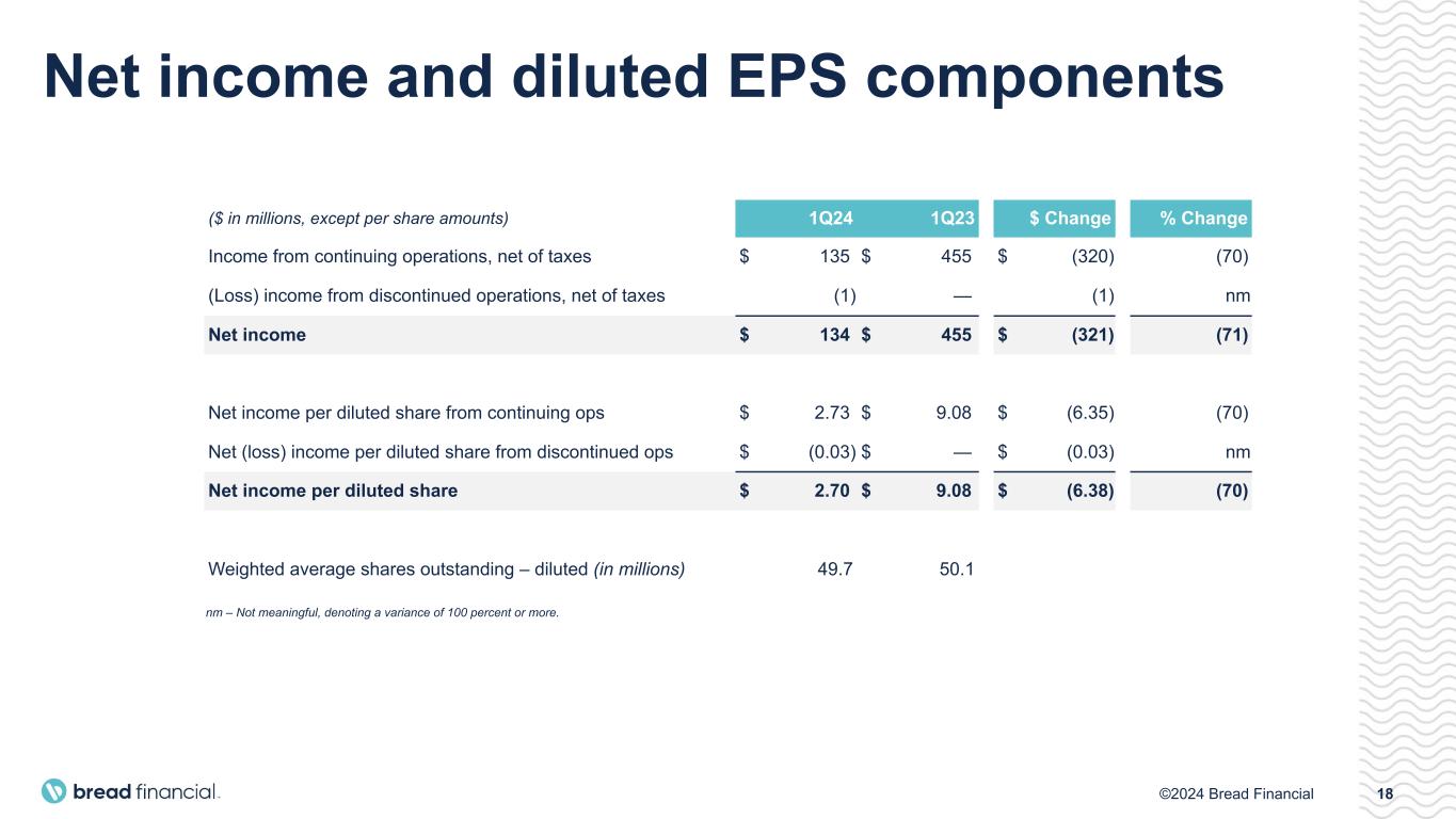17©2024 Bread Financial 1Q24 ($ in millions) Average balance Interest income / expense Average yield / rate Cash and investment securities $ 4,135 $ 53 5.1% Credit card and other loans 18,546 1,247 27.0% Total interest-earning assets 22,681 1,300 23.1% Direct-to-consumer (Retail) 6,739 81 4.9% Wholesale deposits 6,771 74 4.4% Interest-bearing deposits 13,510 155 4.6% Secured borrowings 3,663 63 6.8% Unsecured borrowings 1,354 30 9.0% Interest-bearing borrowings 5,017 93 7.4% Total interest-bearing liabilities $ 18,527 $ 248 5.4% Net interest income $ 1,052 Net interest margin* 18.7% * Net interest margin represents annualized Net interest income divided by average Total interest-earning assets. Note: Beginning in 2024, we revised the calculation of average balances to more closely align with industry practice by incorporating an average daily balance. Prior to 2024, average balances represent the average balance at the beginning and end of each month, averaged over the periods indicated. Net interest margin