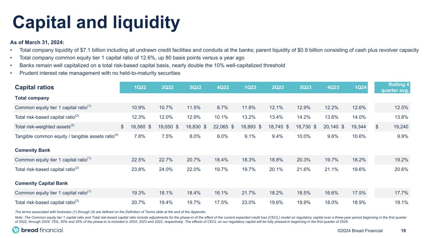18©2024 Bread Financial ($ in millions, except per share amounts) 1Q24 1Q23 $ Change % Change Income from continuing operations, net of taxes $ 135 $ 455 $ (320) (70) (Loss) income from discontinued operations, net of taxes (1) — (1) nm Net income $ 134 $ 455 $ (321) (71) Net income per diluted share from continuing ops $ 2.73 $ 9.08 $ (6.35) (70) Net (loss) income per diluted share from discontinued ops $ (0.03) $ — $ (0.03) nm Net income per diluted share $ 2.70 $ 9.08 $ (6.38) (70) Weighted average shares outstanding – diluted (in millions) 49.7 50.1 Net income and diluted EPS components nm – Not meaningful, denoting a variance of 100 percent or more.