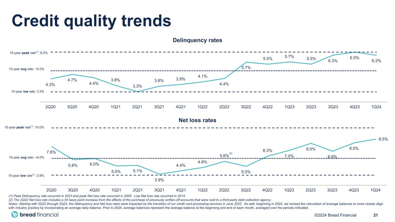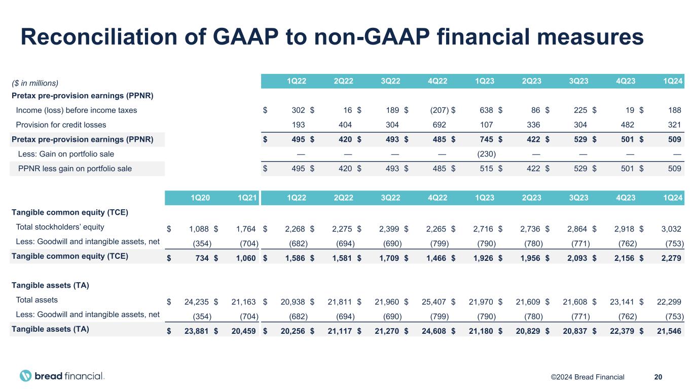 20©2024 Bread Financial ($ in millions) 1Q22 2Q22 3Q22 4Q22 1Q23 2Q23 3Q23 4Q23 1Q24 Pretax pre-provision earnings (PPNR) Income (loss) before income taxes $ 302 $ 16 $ 189 $ (207) $ 638 $ 86 $ 225 $ 19 $ 188 Provision for credit losses 193 404 304 692 107 336 304 482 321 Pretax pre-provision earnings (PPNR) $ 495 $ 420 $ 493 $ 485 $ 745 $ 422 $ 529 $ 501 $ 509 Less: Gain on portfolio sale — — — — (230) — — — — PPNR less gain on portfolio sale $ 495 $ 420 $ 493 $ 485 $ 515 $ 422 $ 529 $ 501 $ 509 1Q20 1Q21 1Q22 2Q22 3Q22 4Q22 1Q23 2Q23 3Q23 4Q23 1Q24 Tangible common equity (TCE) Total stockholders’ equity $ 1,088 $ 1,764 $ 2,268 $ 2,275 $ 2,399 $ 2,265 $ 2,716 $ 2,736 $ 2,864 $ 2,918 $ 3,032 Less: Goodwill and intangible assets, net (354) (704) (682) (694) (690) (799) (790) (780) (771) (762) (753) Tangible common equity (TCE) $ 734 $ 1,060 $ 1,586 $ 1,581 $ 1,709 $ 1,466 $ 1,926 $ 1,956 $ 2,093 $ 2,156 $ 2,279 Tangible assets (TA) Total assets $ 24,235 $ 21,163 $ 20,938 $ 21,811 $ 21,960 $ 25,407 $ 21,970 $ 21,609 $ 21,608 $ 23,141 $ 22,299 Less: Goodwill and intangible assets, net (354) (704) (682) (694) (690) (799) (790) (780) (771) (762) (753) Tangible assets (TA) $ 23,881 $ 20,459 $ 20,256 $ 21,117 $ 21,270 $ 24,608 $ 21,180 $ 20,829 $ 20,837 $ 22,379 $ 21,546 Reconciliation of GAAP to non-GAAP financial measures