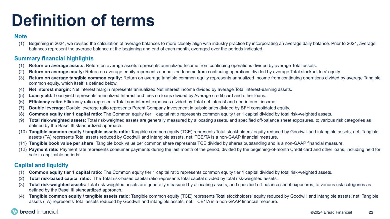 22©2024 Bread Financial Definition of terms Note (1) Beginning in 2024, we revised the calculation of average balances to more closely align with industry practice by incorporating an average daily balance. Prior to 2024, average balances represent the average balance at the beginning and end of each month, averaged over the periods indicated. Summary financial highlights (1) Return on average assets: Return on average assets represents annualized Income from continuing operations divided by average Total assets. (2) Return on average equity: Return on average equity represents annualized Income from continuing operations divided by average Total stockholders’ equity. (3) Return on average tangible common equity: Return on average tangible common equity represents annualized Income from continuing operations divided by average Tangible common equity, which itself is defined below. (4) Net interest margin: Net interest margin represents annualized Net interest income divided by average Total interest-earning assets. (5) Loan yield: Loan yield represents annualized Interest and fees on loans divided by Average credit card and other loans. (6) Efficiency ratio: Efficiency ratio represents Total non-interest expenses divided by Total net interest and non-interest income. (7) Double leverage: Double leverage ratio represents Parent Company investment in subsidiaries divided by BFH consolidated equity. (8) Common equity tier 1 capital ratio: The Common equity tier 1 capital ratio represents common equity tier 1 capital divided by total risk-weighted assets. (9) Total risk-weighted assets: Total risk-weighted assets are generally measured by allocating assets, and specified off-balance sheet exposures, to various risk categories as defined by the Basel III standardized approach. (10) Tangible common equity / tangible assets ratio: Tangible common equity (TCE) represents Total stockholders’ equity reduced by Goodwill and intangible assets, net. Tangible assets (TA) represents Total assets reduced by Goodwill and intangible assets, net. TCE/TA is a non-GAAP financial measure. (11) Tangible book value per share: Tangible book value per common share represents TCE divided by shares outstanding and is a non-GAAP financial measure. (12) Payment rate: Payment rate represents consumer payments during the last month of the period, divided by the beginning-of-month Credit card and other loans, including held for sale in applicable periods. Capital and liquidity (1) Common equity tier 1 capital ratio: The Common equity tier 1 capital ratio represents common equity tier 1 capital divided by total risk-weighted assets. (2) Total risk-based capital ratio: The Total risk-based capital ratio represents total capital divided by total risk-weighted assets. (3) Total risk-weighted assets: Total risk-weighted assets are generally measured by allocating assets, and specified off-balance sheet exposures, to various risk categories as defined by the Basel III standardized approach. (4) Tangible common equity / tangible assets ratio: Tangible common equity (TCE) represents Total stockholders’ equity reduced by Goodwill and intangible assets, net. Tangible assets (TA) represents Total assets reduced by Goodwill and intangible assets, net. TCE/TA is a non-GAAP financial measure.