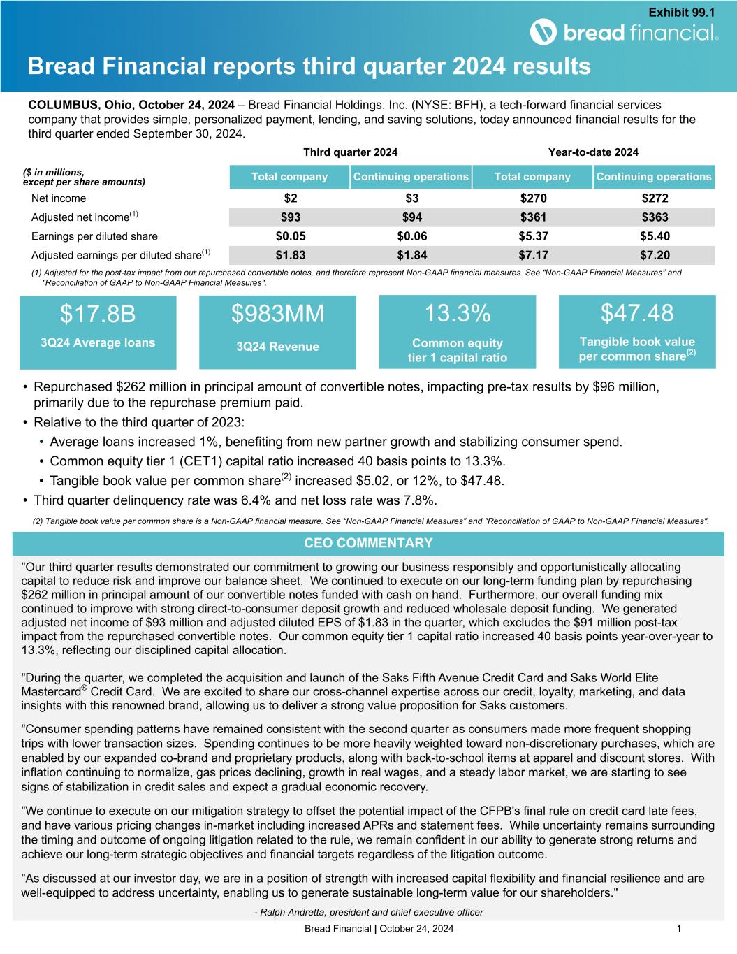 Bread Financial | October 24, 2024 1 • Repurchased $262 million in principal amount of convertible notes, impacting pre-tax results by $96 million, primarily due to the repurchase premium paid. • Relative to the third quarter of 2023: • Average loans increased 1%, benefiting from new partner growth and stabilizing consumer spend. • Common equity tier 1 (CET1) capital ratio increased 40 basis points to 13.3%. • Tangible book value per common share(2) increased $5.02, or 12%, to $47.48. • Third quarter delinquency rate was 6.4% and net loss rate was 7.8%. "Our third quarter results demonstrated our commitment to growing our business responsibly and opportunistically allocating capital to reduce risk and improve our balance sheet. We continued to execute on our long-term funding plan by repurchasing $262 million in principal amount of our convertible notes funded with cash on hand. Furthermore, our overall funding mix continued to improve with strong direct-to-consumer deposit growth and reduced wholesale deposit funding. We generated adjusted net income of $93 million and adjusted diluted EPS of $1.83 in the quarter, which excludes the $91 million post-tax impact from the repurchased convertible notes. Our common equity tier 1 capital ratio increased 40 basis points year-over-year to 13.3%, reflecting our disciplined capital allocation. "During the quarter, we completed the acquisition and launch of the Saks Fifth Avenue Credit Card and Saks World Elite Mastercard® Credit Card. We are excited to share our cross-channel expertise across our credit, loyalty, marketing, and data insights with this renowned brand, allowing us to deliver a strong value proposition for Saks customers. "Consumer spending patterns have remained consistent with the second quarter as consumers made more frequent shopping trips with lower transaction sizes. Spending continues to be more heavily weighted toward non-discretionary purchases, which are enabled by our expanded co-brand and proprietary products, along with back-to-school items at apparel and discount stores. With inflation continuing to normalize, gas prices declining, growth in real wages, and a steady labor market, we are starting to see signs of stabilization in credit sales and expect a gradual economic recovery. "We continue to execute on our mitigation strategy to offset the potential impact of the CFPB's final rule on credit card late fees, and have various pricing changes in-market including increased APRs and statement fees. While uncertainty remains surrounding the timing and outcome of ongoing litigation related to the rule, we remain confident in our ability to generate strong returns and achieve our long-term strategic objectives and financial targets regardless of the litigation outcome. "As discussed at our investor day, we are in a position of strength with increased capital flexibility and financial resilience and are well-equipped to address uncertainty, enabling us to generate sustainable long-term value for our shareholders." - Ralph Andretta, president and chief executive officer Third quarter 2024 Year-to-date 2024 ($ in millions, except per share amounts) Total company Continuing operations Total company Continuing operations Net income $2 $3 $270 $272 Adjusted net income(1) $93 $94 $361 $363 Earnings per diluted share $0.05 $0.06 $5.37 $5.40 Adjusted earnings per diluted share(1) $1.83 $1.84 $7.17 $7.20 Bread Financial reports third quarter 2024 results COLUMBUS, Ohio, October 24, 2024 – Bread Financial Holdings, Inc. (NYSE: BFH), a tech-forward financial services company that provides simple, personalized payment, lending, and saving solutions, today announced financial results for the third quarter ended September 30, 2024. $17.8B 3Q24 Average loans $983MM 3Q24 Revenue 13.3% Common equity tier 1 capital ratio $47.48 Tangible book value per common share(2) (1) Adjusted for the post-tax impact from our repurchased convertible notes, and therefore represent Non-GAAP financial measures. See “Non-GAAP Financial Measures” and "Reconciliation of GAAP to Non-GAAP Financial Measures". CEO COMMENTARY (2) Tangible book value per common share is a Non-GAAP financial measure. See “Non-GAAP Financial Measures” and "Reconciliation of GAAP to Non-GAAP Financial Measures". Exhibit 99.1