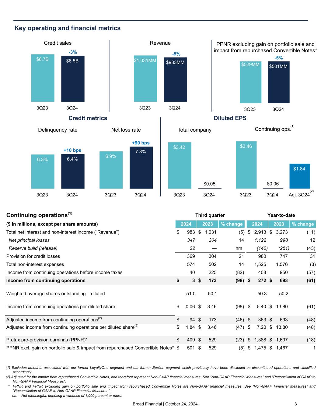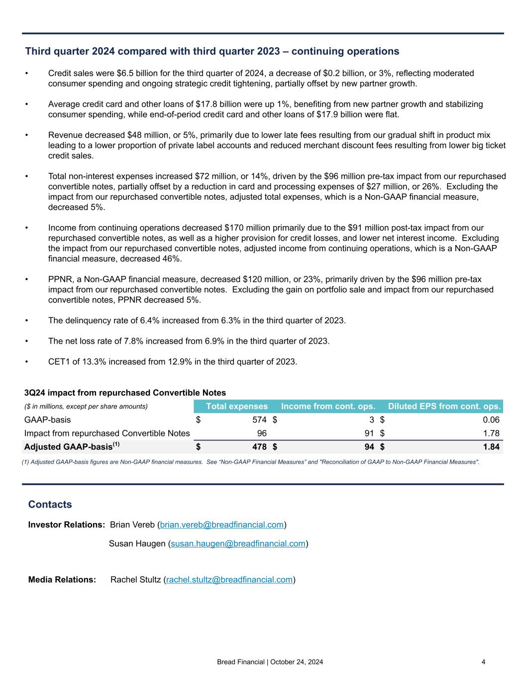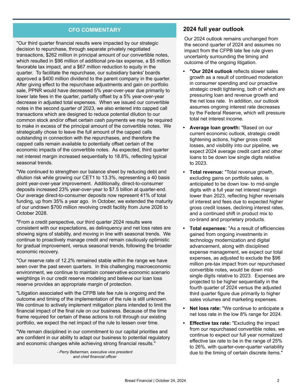 Bread Financial | October 24, 2024 2 "Our third quarter financial results were impacted by our strategic decision to repurchase, through separate privately negotiated transactions, $262 million in principal amount of our convertible notes, which resulted in $96 million of additional pre-tax expense, a $5 million favorable tax impact, and a $67 million reduction to equity in the quarter. To facilitate the repurchase, our subsidiary banks' boards approved a $400 million dividend to the parent company in the quarter. After giving effect to the repurchase adjustments and gain on portfolio sale, PPNR would have decreased 5% year-over-year due primarily to lower late fees in the quarter, partially offset by a 5% year-over-year decrease in adjusted total expenses. When we issued our convertible notes in the second quarter of 2023, we also entered into capped call transactions which are designed to reduce potential dilution to our common stock and/or offset certain cash payments we may be required to make in excess of the principal amount of the convertible notes. We strategically chose to leave the full amount of the capped calls outstanding in connection with the repurchases, and therefore the capped calls remain available to potentially offset certain of the economic impacts of the convertible notes. As expected, third quarter net interest margin increased sequentially to 18.8%, reflecting typical seasonal trends. "We continued to strengthen our balance sheet by reducing debt and dilution risk while growing our CET1 to 13.3%, representing a 40 basis point year-over-year improvement. Additionally, direct-to-consumer deposits increased 23% year-over-year to $7.5 billion at quarter-end. Our average direct-to-consumer deposits now represent 41% of total funding, up from 35% a year ago. In October, we extended the maturity of our undrawn $700 million revolving credit facility from June 2026 to October 2028. "From a credit perspective, our third quarter 2024 results were consistent with our expectations, as delinquency and net loss rates are showing signs of stability, and moving in line with seasonal trends. We continue to proactively manage credit and remain cautiously optimistic for gradual improvement, versus seasonal trends, following the broader economic recovery. "Our reserve rate of 12.2% remained stable within the range we have seen over the past seven quarters. In this challenging macroeconomic environment, we continue to maintain conservative economic scenario weightings in our credit reserve modeling and believe our loan loss reserve provides an appropriate margin of protection. "Litigation associated with the CFPB late fee rule is ongoing and the outcome and timing of the implementation of the rule is still unknown. We continue to actively implement mitigation plans intended to limit the financial impact of the final rule on our business. Because of the time frame required for certain of these actions to roll through our existing portfolio, we expect the net impact of the rule to lessen over time. "We remain disciplined in our commitment to our capital priorities and are confident in our ability to adapt our business to potential regulatory and economic changes while achieving strong financial results." - Perry Beberman, executive vice president and chief financial officer 2024 full year outlook Our 2024 outlook remains unchanged from the second quarter of 2024 and assumes no impact from the CFPB late fee rule given uncertainty surrounding the timing and outcome of the ongoing litigation. • "Our 2024 outlook reflects slower sales growth as a result of continued moderation in consumer spending and our proactive strategic credit tightening, both of which are pressuring loan and revenue growth and the net loss rate. In addition, our outlook assumes ongoing interest rate decreases by the Federal Reserve, which will pressure total net interest income. • Average loan growth: "Based on our current economic outlook, strategic credit tightening actions, higher gross credit losses, and visibility into our pipeline, we expect 2024 average credit card and other loans to be down low single digits relative to 2023. • Total revenue: "Total revenue growth, excluding gains on portfolio sales, is anticipated to be down low- to mid-single digits with a full year net interest margin lower than 2023, reflecting higher reversals of interest and fees due to expected higher gross credit losses, declining interest rates, and a continued shift in product mix to co-brand and proprietary products. • Total expenses: "As a result of efficiencies gained from ongoing investments in technology modernization and digital advancement, along with disciplined expense management, we expect our total expenses, as adjusted to exclude the $96 million pre-tax impact from our repurchased convertible notes, would be down mid- single digits relative to 2023. Expenses are projected to be higher sequentially in the fourth quarter of 2024 versus the adjusted third quarter figure due primarily to higher sales volumes and marketing expenses. • Net loss rate: "We continue to anticipate a net loss rate in the low 8% range for 2024. • Effective tax rate: "Excluding the impact from our repurchased convertible notes, we continue to expect our full year normalized effective tax rate to be in the range of 25% to 26%, with quarter-over-quarter variability due to the timing of certain discrete items." CFO COMMENTARY