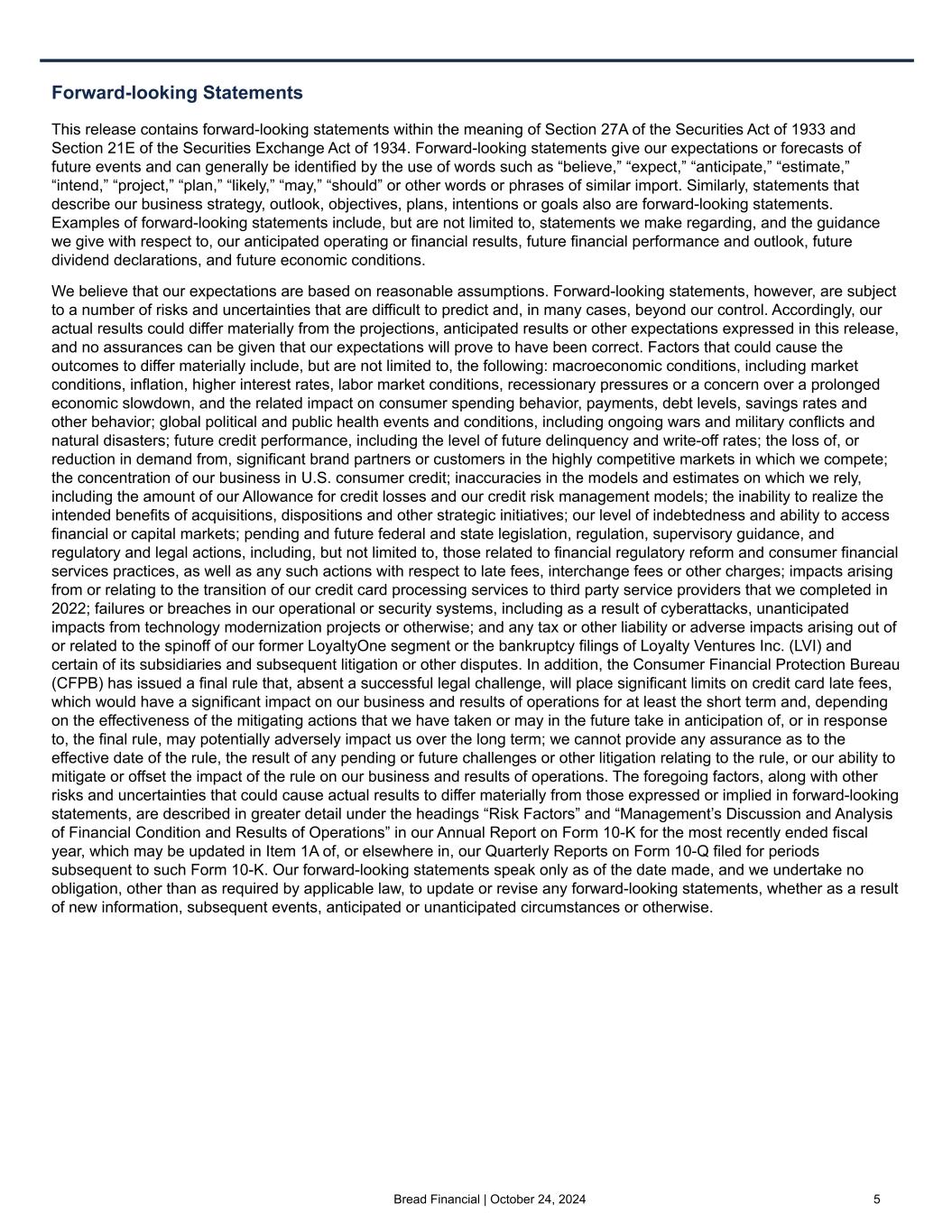 Bread Financial | October 24, 2024 4 Third quarter 2024 compared with third quarter 2023 – continuing operations • Credit sales were $6.5 billion for the third quarter of 2024, a decrease of $0.2 billion, or 3%, reflecting moderated consumer spending and ongoing strategic credit tightening, partially offset by new partner growth. • Average credit card and other loans of $17.8 billion were up 1%, benefiting from new partner growth and stabilizing consumer spending, while end-of-period credit card and other loans of $17.9 billion were flat. • Revenue decreased $48 million, or 5%, primarily due to lower late fees resulting from our gradual shift in product mix leading to a lower proportion of private label accounts and reduced merchant discount fees resulting from lower big ticket credit sales. • Total non-interest expenses increased $72 million, or 14%, driven by the $96 million pre-tax impact from our repurchased convertible notes, partially offset by a reduction in card and processing expenses of $27 million, or 26%. Excluding the impact from our repurchased convertible notes, adjusted total expenses, which is a Non-GAAP financial measure, decreased 5%. • Income from continuing operations decreased $170 million primarily due to the $91 million post-tax impact from our repurchased convertible notes, as well as a higher provision for credit losses, and lower net interest income. Excluding the impact from our repurchased convertible notes, adjusted income from continuing operations, which is a Non-GAAP financial measure, decreased 46%. • PPNR, a Non-GAAP financial measure, decreased $120 million, or 23%, primarily driven by the $96 million pre-tax impact from our repurchased convertible notes. Excluding the gain on portfolio sale and impact from our repurchased convertible notes, PPNR decreased 5%. • The delinquency rate of 6.4% increased from 6.3% in the third quarter of 2023. • The net loss rate of 7.8% increased from 6.9% in the third quarter of 2023. • CET1 of 13.3% increased from 12.9% in the third quarter of 2023. Contacts Investor Relations: Brian Vereb (brian.vereb@breadfinancial.com) Susan Haugen (susan.haugen@breadfinancial.com) Media Relations: Rachel Stultz (rachel.stultz@breadfinancial.com) (1) Adjusted GAAP-basis figures are Non-GAAP financial measures. See “Non-GAAP Financial Measures” and "Reconciliation of GAAP to Non-GAAP Financial Measures". 3Q24 impact from repurchased Convertible Notes ($ in millions, except per share amounts) Total expenses Income from cont. ops. Diluted EPS from cont. ops. GAAP-basis $ 574 $ 3 $ 0.06 Impact from repurchased Convertible Notes 96 91 $ 1.78 Adjusted GAAP-basis(1) $ 478 $ 94 $ 1.84