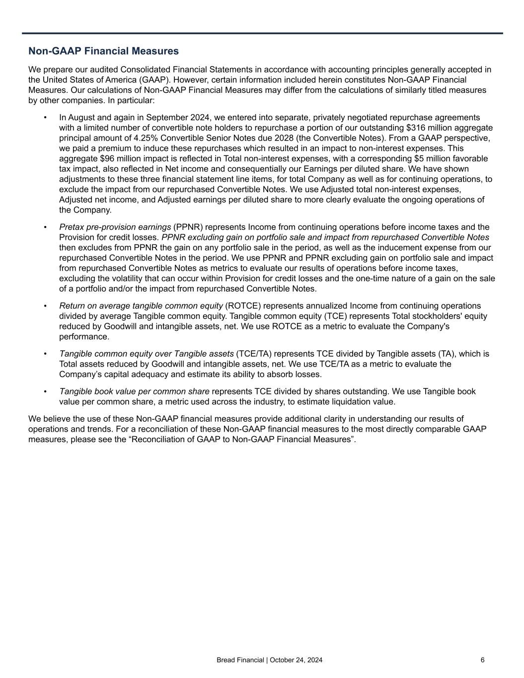 Bread Financial | October 24, 2024 6 Non-GAAP Financial Measures We prepare our audited Consolidated Financial Statements in accordance with accounting principles generally accepted in the United States of America (GAAP). However, certain information included herein constitutes Non-GAAP Financial Measures. Our calculations of Non-GAAP Financial Measures may differ from the calculations of similarly titled measures by other companies. In particular: • In August and again in September 2024, we entered into separate, privately negotiated repurchase agreements with a limited number of convertible note holders to repurchase a portion of our outstanding $316 million aggregate principal amount of 4.25% Convertible Senior Notes due 2028 (the Convertible Notes). From a GAAP perspective, we paid a premium to induce these repurchases which resulted in an impact to non-interest expenses. This aggregate $96 million impact is reflected in Total non-interest expenses, with a corresponding $5 million favorable tax impact, also reflected in Net income and consequentially our Earnings per diluted share. We have shown adjustments to these three financial statement line items, for total Company as well as for continuing operations, to exclude the impact from our repurchased Convertible Notes. We use Adjusted total non-interest expenses, Adjusted net income, and Adjusted earnings per diluted share to more clearly evaluate the ongoing operations of the Company. • Pretax pre-provision earnings (PPNR) represents Income from continuing operations before income taxes and the Provision for credit losses. PPNR excluding gain on portfolio sale and impact from repurchased Convertible Notes then excludes from PPNR the gain on any portfolio sale in the period, as well as the inducement expense from our repurchased Convertible Notes in the period. We use PPNR and PPNR excluding gain on portfolio sale and impact from repurchased Convertible Notes as metrics to evaluate our results of operations before income taxes, excluding the volatility that can occur within Provision for credit losses and the one-time nature of a gain on the sale of a portfolio and/or the impact from repurchased Convertible Notes. • Return on average tangible common equity (ROTCE) represents annualized Income from continuing operations divided by average Tangible common equity. Tangible common equity (TCE) represents Total stockholders' equity reduced by Goodwill and intangible assets, net. We use ROTCE as a metric to evaluate the Company's performance. • Tangible common equity over Tangible assets (TCE/TA) represents TCE divided by Tangible assets (TA), which is Total assets reduced by Goodwill and intangible assets, net. We use TCE/TA as a metric to evaluate the Company’s capital adequacy and estimate its ability to absorb losses. • Tangible book value per common share represents TCE divided by shares outstanding. We use Tangible book value per common share, a metric used across the industry, to estimate liquidation value. We believe the use of these Non-GAAP financial measures provide additional clarity in understanding our results of operations and trends. For a reconciliation of these Non-GAAP financial measures to the most directly comparable GAAP measures, please see the “Reconciliation of GAAP to Non-GAAP Financial Measures”.