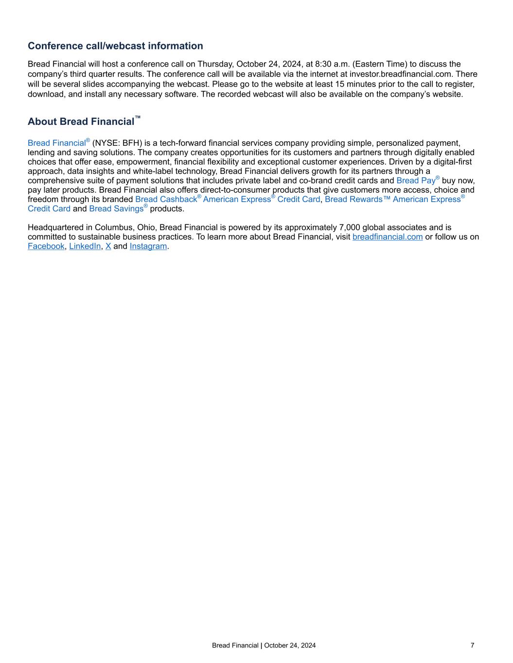 Bread Financial | October 24, 2024 7 Conference call/webcast information Bread Financial will host a conference call on Thursday, October 24, 2024, at 8:30 a.m. (Eastern Time) to discuss the company’s third quarter results. The conference call will be available via the internet at investor.breadfinancial.com. There will be several slides accompanying the webcast. Please go to the website at least 15 minutes prior to the call to register, download, and install any necessary software. The recorded webcast will also be available on the company’s website. About Bread Financial™ Bread Financial® (NYSE: BFH) is a tech-forward financial services company providing simple, personalized payment, lending and saving solutions. The company creates opportunities for its customers and partners through digitally enabled choices that offer ease, empowerment, financial flexibility and exceptional customer experiences. Driven by a digital-first approach, data insights and white-label technology, Bread Financial delivers growth for its partners through a comprehensive suite of payment solutions that includes private label and co-brand credit cards and Bread Pay® buy now, pay later products. Bread Financial also offers direct-to-consumer products that give customers more access, choice and freedom through its branded Bread Cashback® American Express® Credit Card, Bread Rewards™ American Express® Credit Card and Bread Savings® products.         Headquartered in Columbus, Ohio, Bread Financial is powered by its approximately 7,000 global associates and is committed to sustainable business practices. To learn more about Bread Financial, visit breadfinancial.com or follow us on Facebook, LinkedIn, X and Instagram.